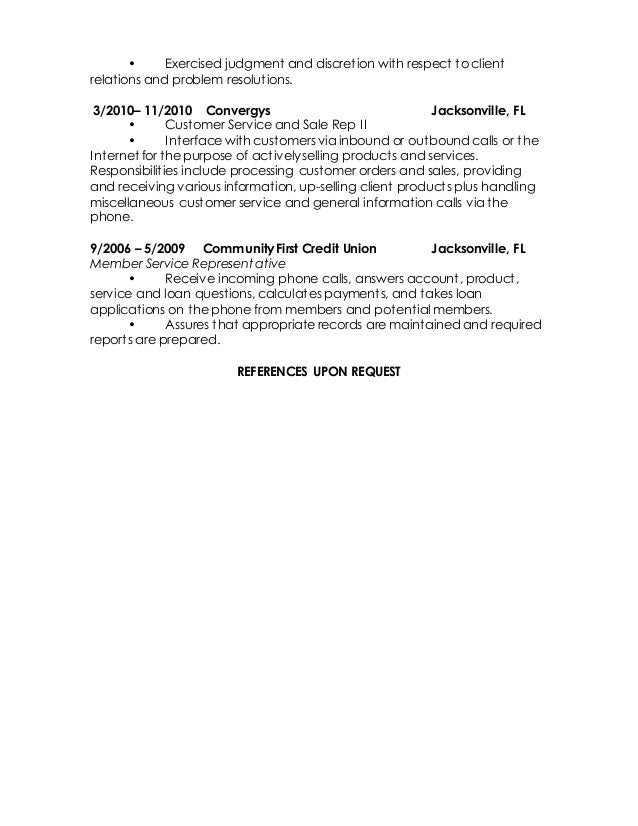 2. 2. • Exercised judgment and discretion with respect to client relations and problem resolutions. 3/2010– 11/2010 Convergys Jacksonville, FL • Customer Service and Sale Rep II • Interface with customers via inbound or outbound calls or the Internet for the purpose of actively selling products and services. Responsibilities include processing customer orders and sales, providing and receiving various information, up-selling client products plus handling miscellaneous customer service and general information calls via the phone. 9/2006 – 5/2009 Community First Credit Union Jacksonville, FL Member Service Represent ative • Receive incoming phone calls, answers account, product, service and loan questions, calculates payments, and takes loan applications on the phone from members and potential members. • Assures that appropriate records are maintained and required reports are prepared. REFERENCES UPON REQUEST