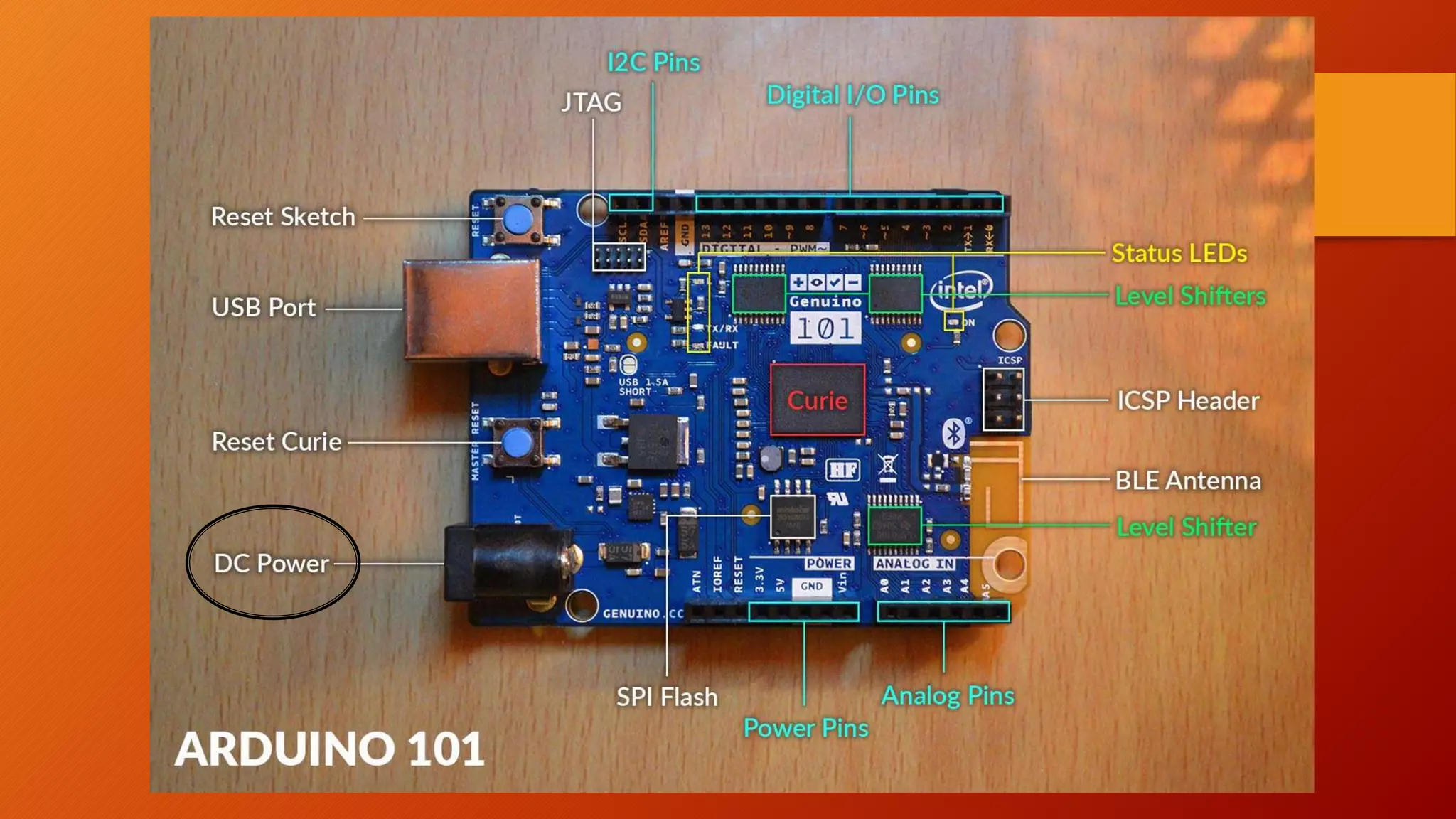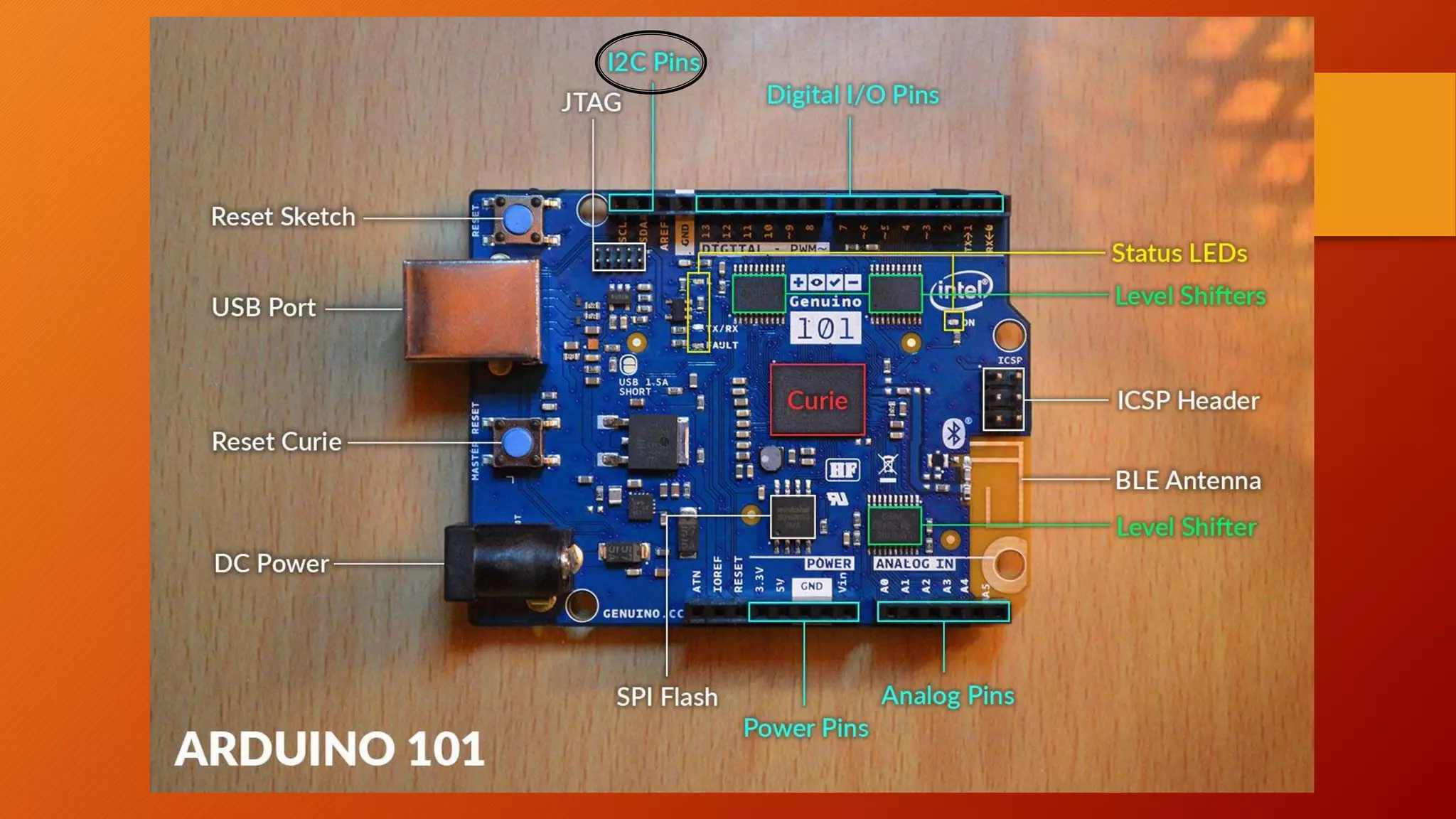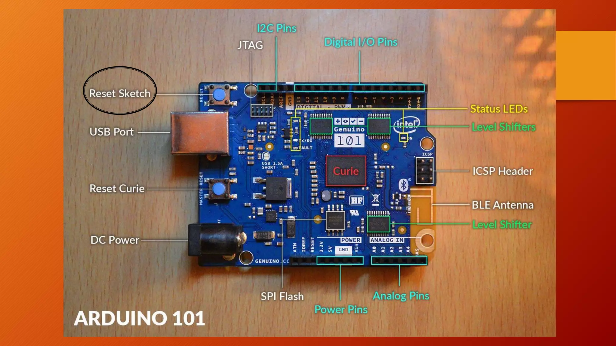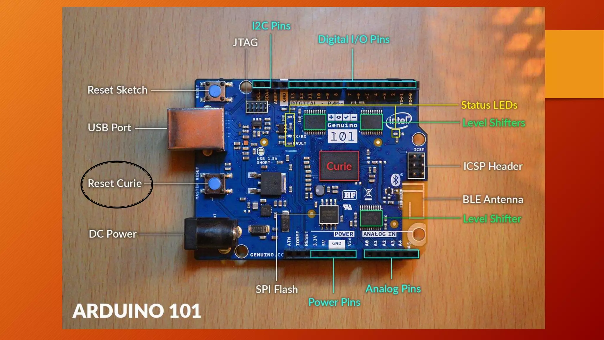 The document introduces the Genuino 101 board and its features. It contains a Curie module with a 32-bit dual core processor running at 32MHz that supports machine learning libraries. It also has a Pattern Matching Engine (PME) that allows for pattern recognition using k-nearest neighbors and Radial Basis Function classification algorithms. The document provides instructions on how to program the board using the Arduino IDE and links to additional resources like a GitHub project page.