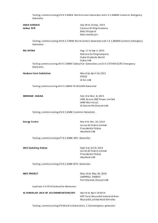 2. 2. Testing, commissioningof 4 X 5.6MVA Wartsilamain Generator and 1 X 1.68MW Cummins Emergency Generator DADA GORGUD Sep 04 to 25 Sep, 2015 Jackup Drill Caspian DrillingCompany Baku Shipyard Baku Azerbaijan Testing, commissioning of 4 X 2.72MW Wartsilamain Generator and 1 X 1.68MW Cummins Emergency Generator. RIG DIYINA Aug. 11 to Sep 3, 2015 National DrillingCompany Dubai Drydocks World Dubai UAE Testing commissioningof 4 X 1.6MW Caterpillar Generators and 1 X 1375KVA (CAT) Emergency Generator. Houbara Farm Substation March to April 16,2015 ATECO Al Ain UAE Testing commissioningof 4 X 1.8MW FG WILSON Generator MERMAID ASIANA Feb. 8 to Mar. 8, 2015 VMS Asiana /NJC Power Limited AHM Marine LLC Al Qasimi Rd,Sharjah UAE Testing, commissioningof 6 X 1.6MW Cummins Generator. Energy Centre Nov 8 to Dec. 20, 2014 Larsen & Toubro Limited Presidential Palace Abudhabi UAE Testing, commissioningof 7 X 2.4MW MTU Generator. W42 Switching Station Sept 6 to Oct 8, 2014 Larsen & Toubro Limited Presidential Palace Abudhabi UAE Testing, commissioningof 3 X 2.4MW MTU Generator. MOS PROJECT May 16 to May 29, 2014 LAMPRELL ENERGY Port Khaleed, Sharjah UAE Load test 5 X 3516 Caterpillar Generator. AL RUMAILAH JACK-UP ACCOMMODATION/GPC April 6 to April 18 2014 GPC Yard, Mussafah Industrial Area Mussafah,United Arab Emirates Testing, commissioningof 4 WartsilaGenerators, 1 Cat emergency generator
