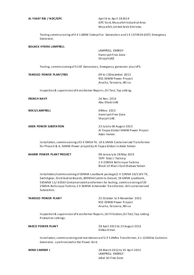 3. 3. AL YASAT RIG / NDC/GPC April 6 to April 18 2014 GPC Yard, Mussafah Industrial Area Mussafah,United Arab Emirates Testing commissioningof 4 X 1.6MW Caterpillar Generators and 1 X 1375KVA (CAT) Emergency Generator. SEAJACK HYDRA LAMPRELL LAMPRELL ENERGY Hamriyah Free Zone ShrajahUAE Testing, commissioningof 5 CAT Generators, Emergency generator plus UPS. TANESCO POWER PLANT/RSS 09 to 13December 2013 RSS 50MW Power Project Arusha,Tanzania,Africa Inspection & supervision of transformer Repairs,Oil Test, Tap setting. FRENCH NAVY 26 Nov. 2013 Abu Dhabi UAE NDC3/LAMPRELL 04Nov. 2013 Hamriyah Free Zone Sharjah UAE ADEN POWER SUBSTATION 23 July to 06 August 2013 Al Taqaa Global 54MW Power Project Aden Yemen Installation,commissioningof 2 X 5MVA TX, 1X 6.3MVA Containerized Transformer for Phase3 & 4, 54MW Power projectby Al Taqaa Global in Aden Yemen. KHARIR POWER PLANT PROJECT 08 January to 28 May 2013 TEPY Total / Technip 2 X 25MVA RollsroyceTurbine Block 10 Kharir EastShabwa Yemen Installation/commissioningof 20MVA Loadbank package(2 X 13MVA 33/11KV TX, Switchgear, Distribution Boards,800KVACummins Genset, 5X 6MVA Loadbank, 5X5MVA 11/.433kV Containerized transformers for testing, commissioningof 2X 25MVA RollsroyceTurbine,2 X 36MVA Scheneider Transformer, GIS containerized Substation. TANESCO POWER PLANT 22 October to 9 November 2012 RSS 50MW Power Project Arusha,Tanzania,Africa Inspection & supervision of transformer Repairs,Oil Filtration,Oil Test,Tap setting Protection settings. RAECO POWER PLANT 28 April 2012 to 15 August 2012 Dibba Oman Installation,commissioning and maintenanceof 2 X 5.8MVa Transformer, 3 x 1250KVa Cummins Generator, synchronized to the Power Grid. WIND CARRIER I 28 March 2012 to 25 April 2012 LAMPRELL ENERGY Jebel Ali Free Zone