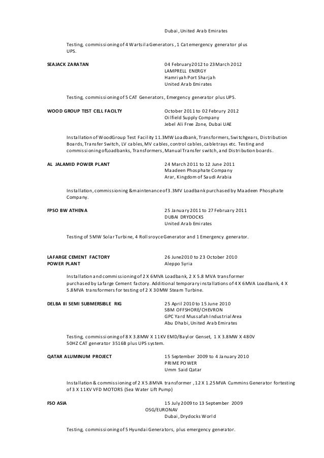 4. 4. Dubai,United Arab Emirates Testing, commissioningof 4 WartsilaGenerators,1 Cat emergency generator plus UPS. SEAJACK ZARATAN 04 February2012 to 23March 2012 LAMPRELL ENERGY Hamriyah Port Sharjah United Arab Emirates Testing, commissioningof 5 CAT Generators, Emergency generator plus UPS. WOOD GROUP TEST CELL FACILTY October 2011 to 02 Februry 2012 Oilfield Supply Company Jebel Ali Free Zone, Dubai UAE Installation of WoodGroup Test Facility 11.3MW Loadbank,Transformers,Switchgears, Distribution Boards,Transfer Switch, LV cables,MV cables,control cables,cabletrays etc. Testing and commissioningofLoadbanks,Transformers,Manual Transfer switch, and Distribution boards. AL JALAMID POWER PLANT 24 March 2011 to 12 June 2011 Maadeen Phosphate Company Arar, Kingdom of Saudi Arabia Installation,commissioning &maintenanceof 3.3MV Loadbank purchased by Maadeen Phosphate Company. FPSO BW ATHENA 25 January 2011 to 27 February 2011 DUBAI DRYDOCKS United Arab Emirates Testing of 5MW Solar Turbine, 4 RollsroyceGenerator and 1 Emergency generator. LAFARGE CEMENT FACTORY 26 June2010 to 23 October 2010 POWER PLANT Aleppo Syria Installation and commissioning of 2 X 6MVA Loadbank, 2 X 5.8 MVA transformer purchased by Lafarge Cement factory. Additional temporary installations of 4 X 6MVA Loadbank, 4 X 5.8MVA transformers for testing of 2 X 30MW Steam Turbine. DELBA III SEMI SUBMERSIBLE RIG 25 April 2010 to 15 June 2010 SBM OFFSHORE/CHEVRON GPC Yard Mussafah Industrial Area Abu Dhabi,United Arab Emirates Testing, commissioningof 8 X 3.8MW X 11KV EMD/Baylor Genset, 1 X 3.8MW X 480V 50HZ CAT generator 3516B plus UPS system. QATAR ALUMINUM PROJECT 15 September 2009 to 4 January 2010 PRIME POWER Umm Said Qatar Installation & commissioning of 2 X 5.8MVA transformer , 12 X 1.25MVA Cummins Generator fortesting of 3 X 11KV VFD MOTORS (Sea Water Lift Pump) FSO ASIA 15 July 2009 to 13 September 2009 OSG/EURONAV Dubai,Drydocks World Testing, commissioningof 5 Hyundai Generators, plus emergency generator.