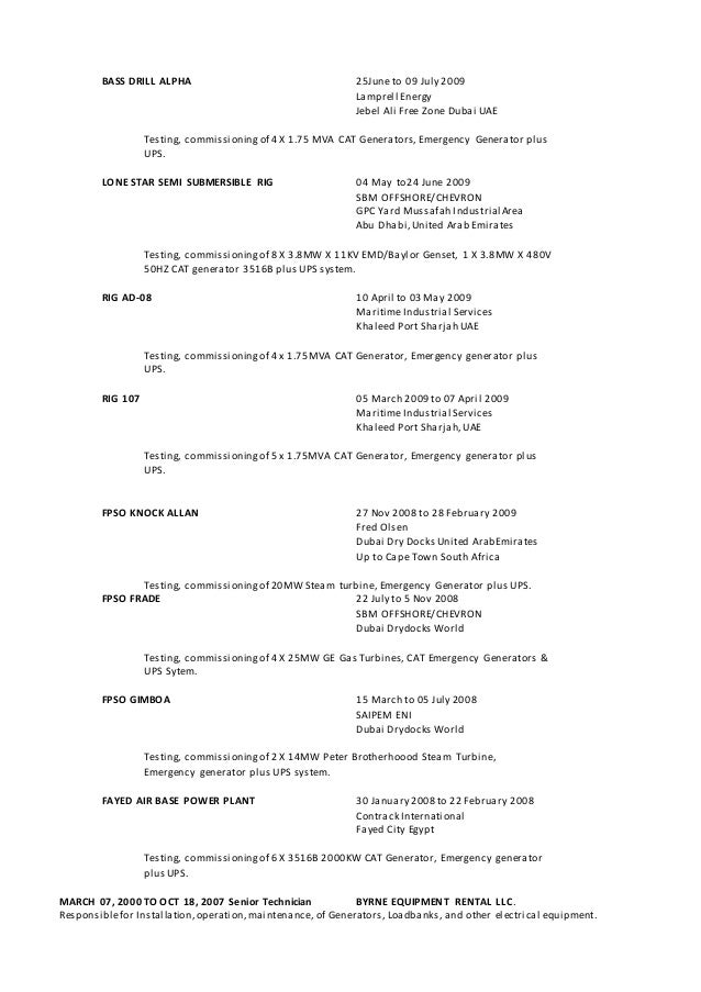 5. 5. BASS DRILL ALPHA 25June to 09 July 2009 Lamprell Energy Jebel Ali Free Zone Dubai UAE Testing, commissioningof 4 X 1.75 MVA CAT Generators, Emergency Generator plus UPS. LONE STAR SEMI SUBMERSIBLE RIG 04 May to24 June 2009 SBM OFFSHORE/CHEVRON GPC Yard Mussafah Industrial Area Abu Dhabi,United Arab Emirates Testing, commissioningof 8 X 3.8MW X 11KV EMD/Baylor Genset, 1 X 3.8MW X 480V 50HZ CAT generator 3516B plus UPS system. RIG AD-08 10 April to 03 May 2009 MaritimeIndustrial Services Khaleed Port Sharjah UAE Testing, commissioningof 4 x 1.75MVA CAT Generator, Emergency generator plus UPS. RIG 107 05 March 2009 to 07 April 2009 MaritimeIndustrial Services Khaleed Port Sharjah,UAE Testing, commissioningof 5 x 1.75MVA CAT Generator, Emergency generator plus UPS. FPSO KNOCK ALLAN 27 Nov 2008 to 28 February 2009 Fred Olsen Dubai Dry Docks United ArabEmirates Up to Cape Town South Africa Testing, commissioningof 20MW Steam turbine, Emergency Generator plus UPS. FPSO FRADE 22 July to 5 Nov 2008 SBM OFFSHORE/CHEVRON Dubai Drydocks World Testing, commissioningof 4 X 25MW GE Gas Turbines, CAT Emergency Generators & UPS Sytem. FPSO GIMBOA 15 March to 05 July 2008 SAIPEM ENI Dubai Drydocks World Testing, commissioningof 2 X 14MW Peter Brotherhoood Steam Turbine, Emergency generator plus UPS system. FAYED AIR BASE POWER PLANT 30 January 2008 to 22 February 2008 Contrack International Fayed City Egypt Testing, commissioningof 6 X 3516B 2000KW CAT Generator, Emergency generator plus UPS. MARCH 07, 2000 TO OCT 18, 2007 Senior Technician BYRNE EQUIPMENT RENTAL LLC. Responsiblefor Installation,operation,maintenance, of Generators, Loadbanks, and other electrical equipment.