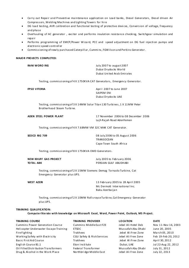 6. 6.  Carry out Repair and Preventive maintenance application on Load banks, Diesel Generators, Diesel driven Air Compressors,WeldingMachines and LightingTowers for hire  DG load testing, AVR calibration and functional testing of protective devices, Conversion of voltage, frequency and phase  Overhauling of AC generator , exciter and performs insulation resistance checking, Switchgear simulation and repair  Performs programming of EMCP/Power Wizard, PCC and speed adjustment on DG fuel injection pumps and electronic speed controller  Commissioningof newly purchased Caterpillar ,Cummins,FGWilson and Perkins Generator. MAJOR PROJECTS COMPLETED: RANI WORO RIG July 2007 to august2007 Dubai Drydocks World Dubai United Arab Emirates Testing, commissioningof 4 X 1750KVA CAT Generators, Emergency Generator. FPSO VITORIA April 2007 to June 2007 SAIPEM ENI Dubai Drydocks UAE Testing, commissioningof 3 X 14MW Solar Titan 130 Turbines, 1 X 11MW Peter Brotherhood Steam Turbine. ADEN STEEL POWER PLANT 17 November 2006 to 08 December 2006 Lajh Rajah Road AdenYemen Testing, commissioningof 4 X 7.68MW VM 32C MAK CAT Generator. SEDCO RIG 709 08 July 2006 to 05 August 2006 TRANSOCEAN Cape Town South Africa Testing, commissioningof 8 X 1750KVA EMD Generators. NEW KHUFF GAS PROJECT July 2005 to February 2006 TOTAL ABK PERSIAN GULF ABUDHABI Testing, commissioningof 2 X 15MW Siemens Demag Tornado Turbine, Cat Emergency Generator plus UPS. WEST AZERI 13 February 2005 to 28 April 2005 Mc Dermott International Inc. Baku Azerbaijan Testing, commissioningof 2 X 10MW RollsroyceTurbine,Cat Emergency Generator plus UPS. TRAINING QUALIFICATION: Computer literate with knowledge on Microsoft Excel, Word, Power Point, Outlook, MS Project. TRAINING COURSE TRAINING PROVIDER LOCATION DATE Cummins Power Generation Course Cummins MiddleEast FZE Jebel Ali Hotel Dxb Nov 11-Nov 16, 2003 Helicopter Underwater Escape Training ETSDC Mussafah Abu Dhabi June 20, 2005 FireFighting Trakhees Jebel Ali Free Zone March 05, 2010 WorkingSafety with Electricity CGU Safety & Risk Services Jebel Ali Free Zone Feb 19-Feb 20, 2012 Basic FirstAid Course Trakhees Jebel Ali Free Zone April 30,2012 English CourseB1.1 Eton Institute Dubai,UAE Jul 22-Aug 22, 2012 Oil Filled Distribution Transformers Federal Transformer Mussafah Abu Dhabi July 31, 2012 Drug & Alcohol in the Work Place Northbridge Middle East Jebel Ali Free Zone July 22, 2013