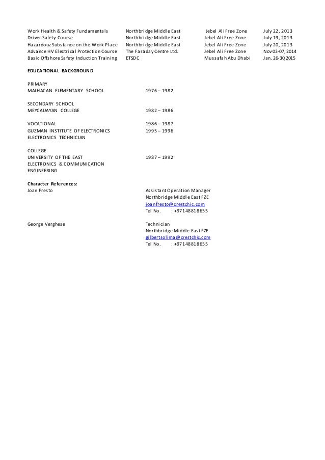 7. 7. Work Health & Safety Fundamentals Northbridge Middle East Jebel Ali Free Zone July 22, 2013 Driver Safety Course Northbridge Middle East Jebel Ali Free Zone July 19, 2013 HazardouzSubstance on the Work Place Northbridge Middle East Jebel Ali Free Zone July 20, 2013 Advance HV Electrical Protection Course The Faraday Centre Ltd. Jebel Ali Free Zone Nov03-07, 2014 Basic OffshoreSafety Induction Training ETSDC Mussafah Abu Dhabi Jan. 26-30,2015 EDUCATIONAL BACKGROUND PRIMARY MALHACAN ELEMENTARY SCHOOL 1976 – 1982 SECONDARY SCHOOL MEYCAUAYAN COLLEGE 1982 – 1986 VOCATIONAL 1986 – 1987 GUZMAN INSTITUTE OF ELECTRONICS 1995 – 1996 ELECTRONICS TECHNICIAN COLLEGE UNIVERSITY OF THE EAST 1987 – 1992 ELECTRONICS & COMMUNICATION ENGINEERING Character References: Joan Fresto AssistantOperation Manager Northbridge Middle EastFZE joanfresto@crestchic.com Tel No. : +97148818655 George Verghese Technician Northbridge Middle EastFZE gilbertsolima@crestchic.com Tel No. : +97148818655