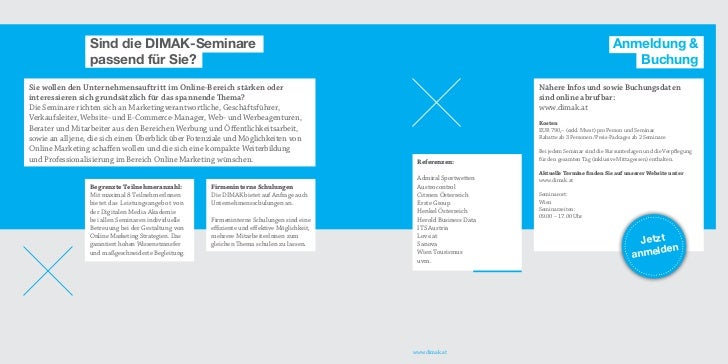 10. 10. Sind die DIMAK-Seminare Anmeldung & passend für Sie? BuchungSie wollen den Unternehmensauftritt im Online-Bereich stärken oder Nähere Infos und sowie Buchungsdateninteressieren sich grundsätzlich für das spannende Thema? sind online abrufbar:Die Seminare richten sich an Marketingverantwortliche, Geschäftsführer, www.dimak.atVerkaufsleiter, Website- und E-Commerce-Manager, Web- und Werbeagenturen, KostenBerater und Mitarbeiter aus den Bereichen Werbung und Öffentlichkeitsarbeit, EUR 790,– (exkl. Mwst) pro Person und Seminarsowie an all jene, die sich einen Überblick über Potenziale und Möglichkeiten von Rabatte ab 3 Personen/Preis-Packages ab 2 SeminareOnline Marketing schaffen wollen und die sich eine kompakte Weiterbildung Bei jedem Seminar sind die Kursunterlagen und die Verpflegungund Professionalisierung im Bereich Online Marketing wünschen. Referenzen: für den gesamten Tag (inklusive Mittagessen) enthalten. Aktuelle Termine finden Sie auf unserer Website unter Admiral Sportwetten www.dimak.at Begrenzte Teilnehmeranzahl: Firmeninterne Schulungen Austrocontrol Mit maximal 8 TeilnehmerInnen Die DIMAK bietet auf Anfrage auch Citroen Österreich Seminarort: bietet das Leistungsangebot von Unternehmensschulungen an. Erste Group Wien der Digitalen Media Akademie Henkel Österreich Seminarzeiten: 09.00 – 17.00 Uhr bei allen Seminaren individuelle Firmeninterne Schulungen sind eine Herold Business Data Betreuung bei der Gestaltung von effiziente und effektive Möglichkeit, ITS Austria Jetzt Online Marketing Strategien. Das mehrere MitarbeiterInnen zum Love.at garantiert hohen Wissenstransfer gleichen Thema schulen zu lassen. Sanova den und maßgeschneiderte Begleitung. Wien Tourismus uvm. anmel www.dimak.at
