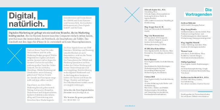 2. 2. Deborah Arpino B.A., M.A. DieDigital, Consulting, Wien Deborah Arpino: Kommunikations- beratung für diverse Direkt- & Vortragenden Gründerinnen und TrainerInnen Agenturkundennatürlich. der DIMAK sind Karin Hammer SAYG GmbH: Econometric Modelling & und Corinna Höll, die Geschäfts- Pitchberatung Andreas Hofmaier führerinnen von „Freie Digitale SAYG GmbH, Managing Partner Mag. Gregor Beer LL.M. GmbH“, und ihr Team. Kraft und Winternitz Rechtsanwälte Mag. Georg Klauda GmbH Goldbach Audience Austria GmbH, WienDigitales Marketing ist gefragt wie nie und eine Branche, die im Marketing Prokurist, Leitung Partner- undkräftig wächst. Bis vor Kurzem konnte man den Computer einfach stehen lassen, Mag. Lisa Ehrenstrasser Produktmanagement, Adserving und UX Consultant, HCI Designerin Mediaplanung, Kampagnenmanagementjetzt hat man ihn immer dabei, als Notebook, als Smartphone, als Tablet. Das iDr – inklusiv Design & researchGeschäft mit den Apps für iPhone & Co. entwickelt sich zum Massenphänomen. Institut für Gestaltung & Mag. Angelika Nemeth Wirkungsforschung, TU Wien Online Marketing Spezialist, Wien Seminar & Schulungsveranstalter Die Freie Digitale bietet seit 2008 DI (FH) Alex Haberfellner Doch ist dieser Trend für jedes Seminare, Workshops und Beratung, Freie Digitale GmbH, Art Director, Wien Thomas Loser Unternehmen und für jedes sowohl öffentlich als auch Konzeption, Screendesign, Interaktions atmedia.at, Chefredakteur, Wien Marketing-Budget geeignet? Welche firmenintern, rund um das Thema Design Redakteur, Content-Manger, Möglichkeiten ergeben sich durch Online Marketing an. Unternehmenskommunikation mobiles Internet und wo liegen die Die TrainerInnen der DIMAK sind Karin Hammer Freie Digitale GmbH, Geschäftsführerin, Phillip Ogunfojuri Grenzen? Suchen Sie nach dem durchweg Spezialisten auf dem Wien Freie Digitale GmbH, Projektmanager, nächsten großen Trend der Online Gebiet der Online Werbung und Querdenkerische Höchstleistungen, Wien Zukunft, der Social Media, weisen Unterrichtspraxis und Medienkonvergente Projekte, Suchmaschinenoptimierung, Google Microblogs, Mobile Marketing und eine langjährige Berufserfahrung Entwicklung Marketing und Professional Suchmaschinenmarketing, Ortsdiensten neuen Schwung in der digitalen Medienwelt auf. Werbestrategien, Freidenkerin Trendscout geben kann? Und wo Dienste In den kompakten Seminaren wie Gowalla und Foursquare vorge- halten sich Theorie und Praxis die Corinna Höll Barbara von Rechbach M.A., B.F.A. Freie Digitale GmbH, Geschäftsführerin, STUDIO VRD, Wien, London, stellt und Apps erklärt werden? Waage. Projekte und Anliegen Wien Geschäftsleitung der TeilnehmerInnen werden soweit 15 Jahre Erfahrung in der Werbe- und the culture consulate, Creative Director ExperInnen aus dem Online wie möglich einbezogen. Mediaplanung, Marketing Bereich geben mittels Klassische-, Online- und Mobile- Vortrag, best practice Beispielen, Infos über die Freie Digitale finden Mediastrategien, Entwicklung Diskussionen und Gruppenarbeiten Sie unter www.freiedigitale.at und Umsetzung von interaktiven fundierte Einblicke in den Arbeits- Kommunikationsmaßnahmen Kurzbiografien der TrainerInnen finden Sie auf unserer Website www.dimak.at alltag und Unterstützung zum Wir beraten Sie gerne persönlich: Erreichen Ihrer Marketingziele. 01 / 89 00 980 - 10 www.dimak.at