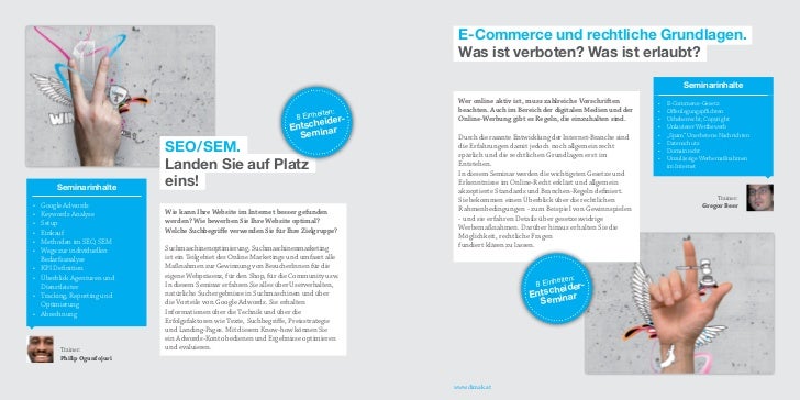 4. 4. E-Commerce und rechtliche Grundlagen. Was ist verboten? Was ist erlaubt? Seminarinhalte Wer online aktiv ist, muss zahlreiche Vorschriften • E­Commerce­Gesetz beachten. Auch im Bereich der digitalen Medien und der iten: • Offenlegungspflichten 8 Einhe eider- Online-Werbung gibt es Regeln, die einzuhalten sind. • Urheberrecht, Copyright Entsch inar • Unlauterer Wettbewerb Sem Durch die rasante Entwicklung der Internet-Branche sind • „Spam“ Unerbetene Nachrichten SEO/SEM. die Erfahrungen damit jedoch noch allgemein recht spärlich und die rechtlichen Grundlagen erst im • • Datenschutz Domainrecht Landen Sie auf Platz • Unzulässige Werbemaßnahmen Entstehen. im Internet In diesem Seminar werden die wichtigsten Gesetze und Seminarinhalte eins! Erkenntnisse im Online-Recht erklärt und allgemein akzeptierte Standards und Branchen-Regeln definiert. Sie bekommen einen Überblick über die rechtlichen Trainer:• Google Adwords Gregor Beer Wie kann Ihre Website im Internet besser gefunden Rahmenbedingungen - zum Beispiel von Gewinnspielen• Keywords Analyse werden? Wie bewerben Sie Ihre Website optimal? - und sie erfahren Details über gesetzeswidrige• Setup Welche Suchbegriffe verwenden Sie für Ihre Zielgruppe? Werbemaßnahmen. Darüber hinaus erhalten Sie die• Einkauf Möglichkeit, rechtliche Fragen• Methoden im SEO, SEM Suchmaschinenoptimierung, Suchmaschinenmarketing fundiert klären zu lassen.• Wege zur individuellen Bedarfsanalyse ist ein Teilgebiet des Online Marketings und umfasst alle• KPI Definition Maßnahmen zur Gewinnung von BesucherInnen für die eigene Webpräsenz, für den Shop, für die Community usw.• Überblick Agenturen und iten: In diesem Seminar erfahren Sie alles über Userverhalten, 8 Einhe er- Dienstleister eid• Tracking, Reporting und natürliche Suchergebnisse in Suchmaschinen und über Entsch inar Optimierung die Vorteile von Google Adwords. Sie erhalten S em• Abrechnung Informationen über die Technik und über die Erfolgsfaktoren wie Texte, Suchbegriffe, Preisstrategie und Landing-Pages. Mit diesem Know-how können Sie ein Adwords-Konto bedienen und Ergebnisse optimieren Trainer: und evaluieren. Philip Ogunfojuri www.dimak.at