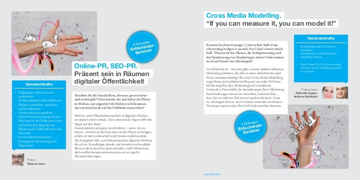 5. 5. Cross Media Modelling. “If you can measure it, you can model it!” Seminarinhalte iten: 8 Einhe eider- Kennen Sie diese Aussage? „I know that half of my Entsch inar • Begriffserklärung Econometric advertising budget is wasted, but I don’t know which Modelling Sem half.“ Warum ist das Planen, die Erfolgsmessung und • Zieldefinition und Planbeispiele die Optimierung von Marketing in weiten Teilen immer • Modelling Prozess noch ein Puzzle/ein Glücksspiel? Online-PR, SEO-PR. Die Wahrheit ist – bis jetzt gibt es keine wirklich effiziente • Kurz: Lernen Sie, Ihre Businessziele mit Econometric Modelling planbar Präsent sein in Räumen zu machen! Marketing-Software, die alles in einer einfachen Art und Weise zusammenbringt. Bis jetzt! Cross Media Modelling Seminarinhalte digitaler Öffentlichkeit zeigt Ihnen auf einfachstem Weg auf, wie jeder Teil Ihres Marketing Mix ihre Marketingziele beeinflusst. Und weil es Ihnen hilft, die Auswirkungen Ihrer Marketing- Trainerinnen:• Zielgruppen erkennen und Entscheidungen besser zu verstehen, bedeutet dies, Deborah Arpino, analysieren Erzählen Sie die Geschichten, die man gerne weiter- Andreas Hofmaier dass Sie es nächstes Mal besser machen können. Ganz• Kommunikationsziele definieren und wiedergibt? Oder kaufen Sie sich lieber die Plätze zu schweigen davon, wie Sie damit entweder ein kleines• Medien auswählen, verstehen in Medien, um ungestört die Bühne zu bekommen, Vermögen sparen oder Ihre Ziele höherstecken können. und kombinieren um von dort herab auf das Publikum einzureden?• Kommunikation gestalten unter der Voraussetzung dessen Medien- und Öffentlichkeitsarbeit in digitalen Medien Relevanz für die Zielgruppe sowie ist einfach nicht einfach. Diese rhetorische Figur trifft den iten: unter Berücksichtigung von Nagel auf den Kopf. 4 Einhe er- eid Effizienz und Effektivität für den Grundsätzlich sind gute Geschichten – wenn Sie sie Entsch inar Absender haben – einfach an die Frau oder an den Mann zu bringen, S em• Kommunikationsanalyse, sofern sie mit Leidenschaft und Freude erzählt werden. Kampagnen­Monitoring und Das komplexe Mit- und Nebeneinander digitaler Medien, ­Reporting die sich in Grundzügen ähneln, auf formaler und medialer Ebene jedoch deutlich unterscheiden, stellt Menschen, die beruflich kommunizieren müssen, vor große Herausforderungen. Trainer: Thomas Loser www.dimak.at