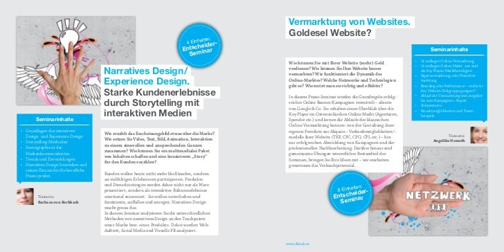 8. 8. Vermarktung von Websites. Goldesel Website? iten: 4 Einhe er- eid Entsch inar Seminarinhalte Sem • Grundlagen Online­Vermarktung Wie können Sie mit Ihrer Website (mehr) Geld • Grundlagen Online Markt: wer sind Narratives Design/ verdienen? Wie können Sie Ihre Website besser vermarkten? Wie funktioniert die Dynamik des die Key Player/Marktbeteiligten • Eigenvermarktung oder Fremdver­ Experience Design. Online-Marktes? Welche Netzwerke und Technologien gibt es? Wie nutzt man sie richtig und effektiv? marktung • Branding oder Performance – wofür ist Starke Kundenerlebnisse In diesem Praxis Seminar werden die Grundregeln erfolg- ihre Website/Zielgruppe geeignet? • Ablauf der Vermarktung vom Angebot durch Storytelling mit reicher Online Banner-Kampagnen vermittelt – abseits von Google & Co. Sie erhalten einen Überblick über die bis zum Kampagnen – Report • Stolpersteine Seminarinhalte interaktiven Medien Key Player im Österreichischen Online Markt (Agenturen, Spender etc.) und lernen die Abläufe der klassischen • Einsatzmöglichkeiten und Praxis­ beispiele Online Vermarktung kennen: von der Gestaltung ihrer• Grundlagen des narrativen eigenen Preisliste zur Akquise - Verkaufsmöglichkeiten/- Wie erzählt das Erscheinungsbild etwas über die Marke? Trainerin: Design und Experience Design modelle ihrer Website (TKP, CPC, CPO, CPL etc.) – hin Wie setzen Sie Video, Text, Bild, Animation, Interaktion Angelika Nemeth• Storytelling­Methoden zur erfolgreichen Abwicklung von Kampagnen und der zu einem sinnvollen und ansprechenden Ganzen• Szenographie in der professionellen Nachbearbeitung. Darüber hinaus sind zusammen? Wie können Sie ein multimediales Paket Markenkommunikation gemeinsame Übungen wesentlicher Bestandteil des von Inhalten schaffen und eine konsistente „Story“• Trends und Entwicklungen Seminars, bringen Sie Ihre Ideen mit – wir erarbeiten für den Kunden erzählen?• Narratives Design beurteilen und gemeinsam das Verkaufspotenzial. seinen Einsatz für die berufliche Kunden wollen heute nicht mehr bloß kaufen, sondern Praxis prüfen an vielfältigen Erlebnissen partizipieren. Produkte und Dienstleistungen werden daher nicht nur als Ware iten: präsentiert, sondern als interaktive Bühnenerlebnisse 8 Einhe er- eid Trainerin: emotional inszeniert. Sie wollen unterhalten und Entsch inar Barbara von Rechbach faszinieren, auffallen und anregen. Narratives Design Sem macht genau das. In diesem Seminar analysieren Sie die unterschiedlichen Methoden von narrativem Design an den Touchpoints einer Marke bzw. eines Produkts. Dabei werden Web- Auftritt, Social Media und Visuelle PR analysiert. www.dimak.at