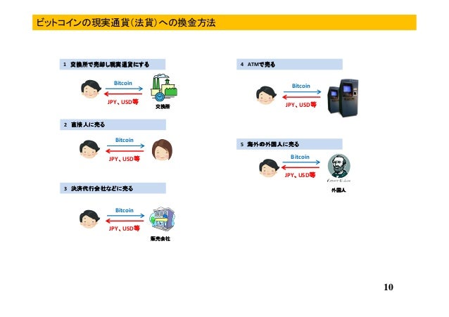 9. 9. 交換所交換所交換所交換所 JPY、、、、USD等等等等 Bitcoin Bitcoin Litecoin等等等等 Bitcoin JPY、、、、USD等等等等 Bitcoin モノ、サービスの提供モノ、サービスの提供モノ、サービスの提供モノ、サービスの提供 Bitcoin 交換所交換所交換所交換所 1 交換所で現実通貨で購入交換所で現実通貨で購入交換所で現実通貨で購入交換所で現実通貨で購入 2 交換所で他の仮想通貨と交換交換所で他の仮想通貨と交換交換所で他の仮想通貨と交換交換所で他の仮想通貨と交換 3 直接人から購入直接人から購入直接人から購入直接人から購入 4 直接人から貰う直接人から貰う直接人から貰う直接人から貰う 5 サービスの対価として受け取るサービスの対価として受け取るサービスの対価として受け取るサービスの対価として受け取る ビットコインの入手方法 Bitcoin マイニングでマイニングでマイニングでマイニングで 入手入手入手入手 Bitcoin JPY、、、、USD等等等等 販売会社や販売会社や販売会社や販売会社や ビットコインビットコインビットコインビットコインATM Bitcoin JPY、、、、USD等等等等 外国人外国人外国人外国人 6 販売代理店、販売代理店、販売代理店、販売代理店、ATMから購入するから購入するから購入するから購入する 7 海外の外国人から買う海外の外国人から買う海外の外国人から買う海外の外国人から買う 8 マイニングで発掘するマイニングで発掘するマイニングで発掘するマイニングで発掘する ※マイニングとは,ビットコインシステ ムの共同維持作業のこと。ビットコイン で報酬が支払われる 9