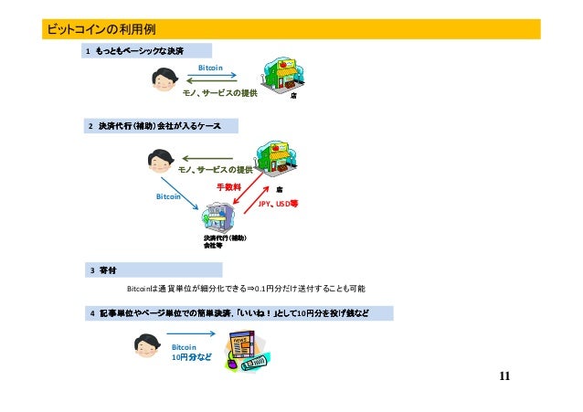11. 11. 1 もっともベーシックな決済もっともベーシックな決済もっともベーシックな決済もっともベーシックな決済 Bitcoin 決済代行(補助)決済代行(補助)決済代行(補助)決済代行(補助) 会社等会社等会社等会社等 モノ、サービスの提供モノ、サービスの提供モノ、サービスの提供モノ、サービスの提供 店店店店 2 決済代行(補助)会社が入るケース決済代行(補助)会社が入るケース決済代行(補助)会社が入るケース決済代行(補助)会社が入るケース Bitcoin モノ、サービスの提供モノ、サービスの提供モノ、サービスの提供モノ、サービスの提供 店店店店 JPY、、、、USD等等等等 手数料手数料手数料手数料 ビットコインの利用例 Bitcoin 10円分など円分など円分など円分など 4 記事単位やページ単位での簡単決済,「いいね!」として記事単位やページ単位での簡単決済,「いいね!」として記事単位やページ単位での簡単決済,「いいね!」として記事単位やページ単位での簡単決済,「いいね!」として10円分を投げ銭など円分を投げ銭など円分を投げ銭など円分を投げ銭など 3 寄付寄付寄付寄付 Bitcoinは通貨単位が細分化できる⇒0.1円分だけ送付することも可能 11