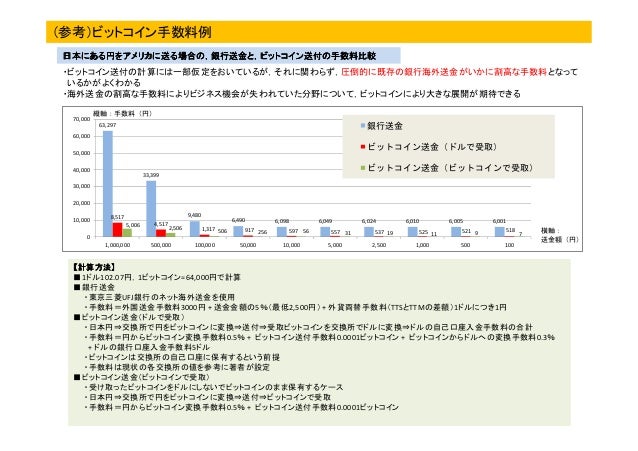 12. 12. 日本にある円をアメリカに送る場合の,銀行送金と,ビットコイン送付の手数料比較日本にある円をアメリカに送る場合の,銀行送金と,ビットコイン送付の手数料比較日本にある円をアメリカに送る場合の,銀行送金と,ビットコイン送付の手数料比較日本にある円をアメリカに送る場合の,銀行送金と,ビットコイン送付の手数料比較 (参考)ビットコイン手数料例 12 63,297 33,399 9,480 6,490 6,098 6,049 6,024 6,010 6,005 6,001 8,517 4,517 1,317 917 597 557 537 525 521 518 5,006 2,506 506 256 56 31 19 11 9 7 0 10,000 20,000 30,000 40,000 50,000 60,000 70,000 1,000,000 500,000 100,000 50,000 10,000 5,000 2,500 1,000 500 100 銀行送金 ビットコイン送金(ドルで受取) ビットコイン送金(ビットコインで受取) 縦軸:手数料(円) 横軸: 送金額(円) ・ビットコイン送付の計算には一部仮定をおいているが,それに関わらず,圧倒的に既存の銀行海外送金がいかに割高な手数料となって いるかがよくわかる ・海外送金の割高な手数料によりビジネス機会が失われていた分野について,ビットコインにより大きな展開が期待できる 【【【【計算方法計算方法計算方法計算方法】】】】 ■1ドル102.07円,1ビットコイン=64,000円で計算 ■銀行送金 ・東京三菱UFJ銀行のネット海外送金を使用 ・手数料=外国送金手数料3000円 + 送金金額の5%(最低2,500円) + 外貨両替手数料(TTSとTTMの差額)1ドルにつき1円 ■ビットコイン送金(ドルで受取) ・日本円⇒交換所で円をビットコインに変換⇒送付⇒受取ビットコインを交換所でドルに変換⇒ドルの自己口座入金手数料の合計 ・手数料=円からビットコイン変換手数料0.5% + ビットコイン送付手数料0.0001ビットコイン + ビットコインからドルへの変換手数料0.3% + ドルの銀行口座入金手数料5ドル ・ビットコインは交換所の自己口座に保有するという前提 ・手数料は現状の各交換所の値を参考に著者が設定 ■ビットコイン送金(ビットコインで受取) ・受け取ったビットコインをドルにしないでビットコインのまま保有するケース ・日本円⇒交換所で円をビットコインに変換⇒送付⇒ビットコインで受取 ・手数料=円からビットコイン変換手数料0.5% + ビットコイン送付手数料0.0001ビットコイン