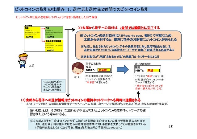 14. 14. 14 ビットコインの取引の仕組みの 概要を理解する ●仕組みをしっかりと理解するには,暗号やITの詳しい知識が 必要となりますが,ここではそのような知識が無くても ざっくりと仕組みの概要を把握頂けるよう,かなり簡略化した 説明を行っています。 ※入門者向けに一部分かりやすいように意訳した説明をしている箇所があります 予めご了承ください。