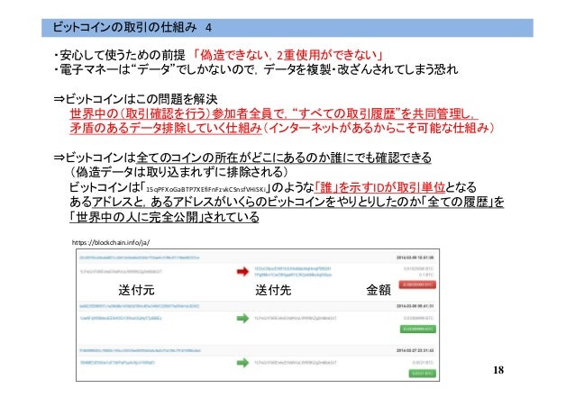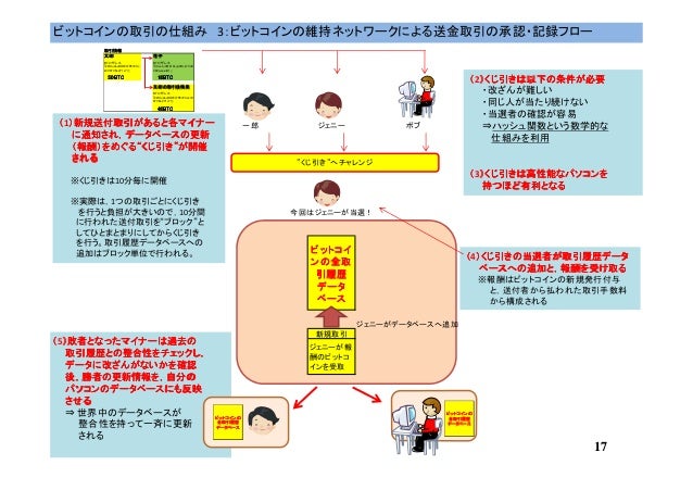 17. 17. ((((5)敗者となったマイナーは過去の)敗者となったマイナーは過去の)敗者となったマイナーは過去の)敗者となったマイナーは過去の 取引履歴との整合性をチェックし,取引履歴との整合性をチェックし,取引履歴との整合性をチェックし,取引履歴との整合性をチェックし, データに改ざんがないかを確認データに改ざんがないかを確認データに改ざんがないかを確認データに改ざんがないかを確認 後,勝者の更新情報を,自分の後,勝者の更新情報を,自分の後,勝者の更新情報を,自分の後,勝者の更新情報を,自分の パソコンのデータベースにも反映パソコンのデータベースにも反映パソコンのデータベースにも反映パソコンのデータベースにも反映 させるさせるさせるさせる ⇒ 世界中のデータベースが 整合性を持って一斉に更新 される 一郎 ジェニー ボブ 今回はジェニーが当選! ビットコイビットコイビットコイビットコイ ンの全取ンの全取ンの全取ンの全取 引履歴引履歴引履歴引履歴 データデータデータデータ ベースベースベースベース ジェニーがデータベースへ追加 新規取引 ジェニーが報 酬のビットコ インを受取 ”くじ引き”へチャレンジ ビットコインのビットコインのビットコインのビットコインの 全取引履歴全取引履歴全取引履歴全取引履歴 データベースデータベースデータベースデータベース ビットコインのビットコインのビットコインのビットコインの 全取引履歴全取引履歴全取引履歴全取引履歴 データベースデータベースデータベースデータベース 17 ((((1)新規送付取引があると各マイナー)新規送付取引があると各マイナー)新規送付取引があると各マイナー)新規送付取引があると各マイナー に通知され,データベースの更新に通知され,データベースの更新に通知され,データベースの更新に通知され,データベースの更新 (報酬)をめぐる“くじ引き”が開催(報酬)をめぐる“くじ引き”が開催(報酬)をめぐる“くじ引き”が開催(報酬)をめぐる“くじ引き”が開催 されるされるされるされる ※くじ引きは10分毎に開催 ※実際は,1つの取引ごとにくじ引き を行うと負担が大きいので,10分間 に行われた送付取引を“ブロック”と してひとまとまりにしてからくじ引き を行う。取引履歴データベースへの 追加はブロック単位で行われる。 ((((2)くじ引きは以下の条件が必要)くじ引きは以下の条件が必要)くじ引きは以下の条件が必要)くじ引きは以下の条件が必要 ・改ざんが難しい ・同じ人が当たり続けない ・当選者の確認が容易 ⇒ハッシュ関数という数学的な 仕組みを利用 ((((3))))くじ引きくじ引きくじ引きくじ引きはははは高性能高性能高性能高性能なパソコンをなパソコンをなパソコンをなパソコンを 持つほど有利となる持つほど有利となる持つほど有利となる持つほど有利となる ビットコインの取引の仕組み 3:ビットコインの維持ネットワークによる送金取引の承認・記録フロー 取引情報取引情報取引情報取引情報 太郎太郎太郎太郎 花子花子花子花子 BTCアドレス 「22StuXaoDIDELTPErEXc k3V8T3KeZY1s77」 BTCアドレス 「XXoo1uXW214Lqir9Ock7VdZ Z89wepiuIU1」  50BTC50BTC50BTC50BTC  10BTC 10BTC 10BTC 10BTC 太郎の取引後残高太郎の取引後残高太郎の取引後残高太郎の取引後残高 BTCアドレス 「22StuXaoDIDELTPErEXck3V 8T3KeZY1s77」  40BTC 40BTC 40BTC 40BTC ((((4)くじ)くじ)くじ)くじ引き引き引き引きの当選者が取引履歴データの当選者が取引履歴データの当選者が取引履歴データの当選者が取引履歴データ ベースへの追加と,報酬を受け取るベースへの追加と,報酬を受け取るベースへの追加と,報酬を受け取るベースへの追加と,報酬を受け取る ※報酬はビットコインの新規発行付与 と,送付者から払われた取引手数料 から構成される