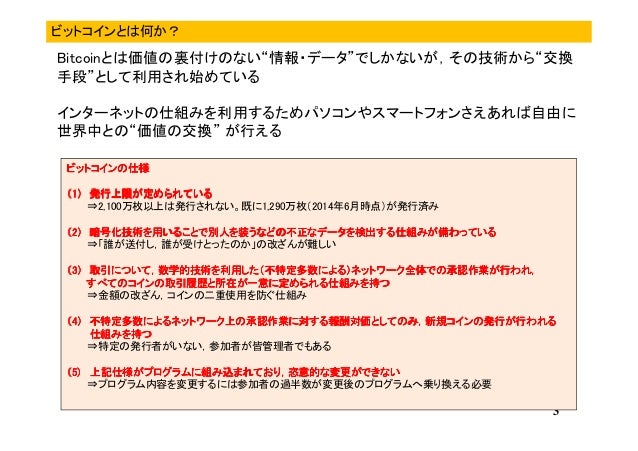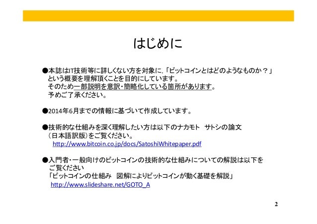 2. 2. 2 はじめに ●本誌はIT技術等に詳しくない方を対象に,「ビットコインとはどのようなものか?」 という概要を理解頂くことを目的にしています。 そのため一部説明を意訳・簡略化している箇所があります。 予めご了承ください。 ●2014年6月までの情報に基づいて作成しています。 ●技術的な仕組みを深く理解したい方は以下のナカモト サトシの論文 (日本語訳版)をご覧ください。 http://www.bitcoin.co.jp/docs/SatoshiWhitepaper.pdf ●入門者・一般向けのビットコインの技術的な仕組みについての解説は以下を ご覧ください 「ビットコインの仕組み 図解によりビットコインが動く基礎を解説」 http://www.slideshare.net/GOTO_A