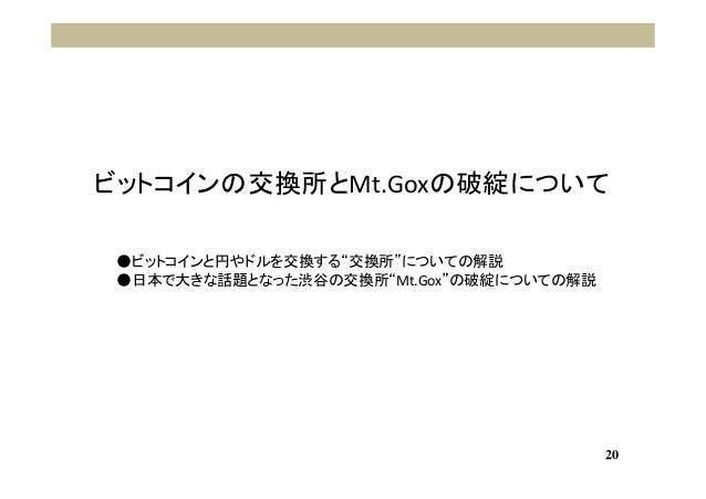20. 20. 20 ビットコインの交換所とMt.Goxの破綻について ●ビットコインと円やドルを交換する“交換所”についての解説 ●日本で大きな話題となった渋谷の交換所“Mt.Gox”の破綻についての解説