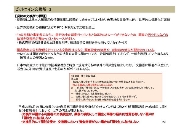 22. 22. 【【【【現状の交換所の課題現状の交換所の課題現状の交換所の課題現状の交換所の課題】】】】 ・交換所による本人確認用の情報収集は段階的に始まってはいるが、未実施の交換所もあり,世界的な標準化が課題 ・世界の交換所の連携によるマネロン対策などまだ検討途上 ・FXの初期の事業者のように,銀行送金を都度行っていると効率的なトレードができないため,顧客の円やドルなどの 法貨を交換所が預かっているケースが多い。 (株式売買での証券会社と証券取引所,信託銀行の機能を併せ持っているイメージ) ・顧客資産の分別管理を行っている交換所は少なく,顧客資産の流用や,破綻時の消失が懸念されている。 ⇒Mt.Goxは顧客の円やドルなどの法貨を大量に預かっており,分別管理をしておらず,一部を流用していた噂もあり, 被害拡大の要因となった。 ・日本の出資法では銀行や証券会社など特別に規定するもの以外の預り金を禁止しており,交換所に顧客が入金した 現金(法貨)は出資法違反であるのかがポイントになる。 ビットコイン交換所 2 (出資法 預り金の禁止) 第二条 業として預り金をするにつき他の法律に特別の規定のある者を除く外、 何人も業として預り金をしてはならない。 2 前項の「預り金」とは、不特定かつ多数の者からの金銭の受入れであつて、 次に掲げるものをいう。 一 預金、貯金又は定期積金の受入れ 二 社債、借入金その他いかなる名義をもつてするかを問わず、 前号に掲げるものと同様の経済的性質を有するもの 22 平成26年6月19日に公表された自民党IT戦略特命委員会「ビットコインをはじめとする「価値記録」への対応に関す る【中間報告】」において,以下の考えが示された。 ・交換所・交換所・交換所・交換所が預かる利用者の交換資金が預かる利用者の交換資金が預かる利用者の交換資金が預かる利用者の交換資金は,業務は,業務は,業務は,業務の実態として預金と同様の経済的性質を有しない限りの実態として預金と同様の経済的性質を有しない限りの実態として預金と同様の経済的性質を有しない限りの実態として預金と同様の経済的性質を有しない限りはははは 「「「「預り金」に該当預り金」に該当預り金」に該当預り金」に該当しないしないしないしない ・交換・交換・交換・交換目的にて預託を目的にて預託を目的にて預託を目的にて預託を受け,交換所受け,交換所受け,交換所受け,交換所において資金滞留がないにおいて資金滞留がないにおいて資金滞留がないにおいて資金滞留がない場合は場合は場合は場合は「預り金」に該当「預り金」に該当「預り金」に該当「預り金」に該当しないしないしないしない