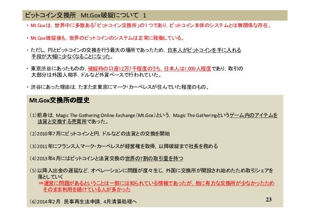23. 23. ビットコイン交換所 Mt.Gox破綻について 1 Mt.Gox交換所の歴史交換所の歴史交換所の歴史交換所の歴史 (1)前身は,Magic The Gathering Online Exchange(Mt.Gox)という, Magic The Gatheringというゲーム内のアイテムを 法貨と交換する売買所であった。 (2)2010年7月にビットコインと円,ドルなどの法貨との交換を開始 (3)2011年にフランス人マーク・カーペレスが経営権を取得,以降破綻まで社長を務める (4)2013年4月にはビットコインと法貨交換の世界の7割の取引量を持つ (5)以降入出金の遅延など,オペレーションに問題が度々生じ,外国に交換所が開設され始めたため取引シェアを 落としていく ⇒運営に問題があるということは一部には知られている情報であったが,他に有力な交換所が少なかったため そのまま利用を続けている人が多かった (6)2014年2月 民事再生法申請,4月清算処理へ ・ Mt.Goxは,世界中に多数ある「ビットコイン交換所」の1つであり,ビットコイン本体のシステムとは無関係な存在。 ・ Mt.Gox破綻後も,世界のビットコインのシステムは正常に稼働している。 ・ ただし,円とビットコインの交換を行う最大の場所であったため,日本人がビットコインを手に入れる 手段が大幅に少なくなることになった。 ・ 東京渋谷にあったものの,破綻時の口座12万7千程度のうち,日本人は1,000人程度であり,取引の 大部分は外国人相手,ドルなど外貨ベースで行われていた。 ・ 渋谷にあった理由は,たまたま東京にマーク・カーペレスが住んでいた程度のもの。 23