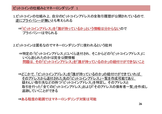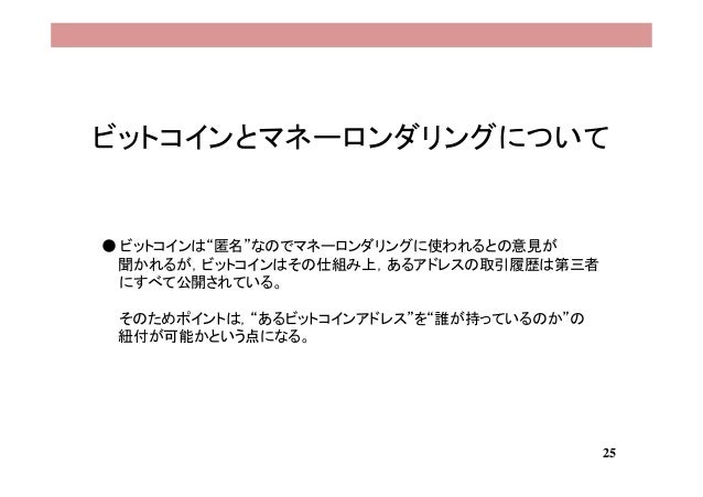 25. 25. 25 ビットコインとマネーロンダリングについて ● ビットコインは“匿名”なのでマネーロンダリングに使われるとの意見が 聞かれるが,ビットコインはその仕組み上,あるアドレスの取引履歴は第三者 にすべて公開されている。 そのためポイントは,“あるビットコインアドレス”を“誰が持っているのか”の 紐付が可能かという点になる。