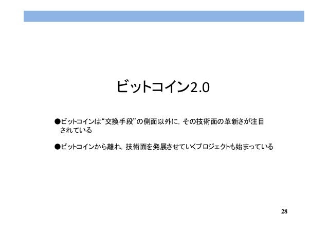 28. 28. 28 ビットコイン2.0 ●ビットコインは“交換手段”の側面以外に,その技術面の革新さが注目 されている ●ビットコインから離れ,技術面を発展させていくプロジェクトも始まっている