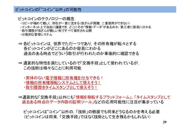 29. 29. 29 ビットコインの「“コイン“以外」の可能性 ビットコインのテクノロジーの概念 ・コピーが極めて難しく,所在が一意に定まる(改ざんが困難,二重使用ができない) ・インターネット上で自由に譲渡でき,どこにその“情報・データ”があるのか,第三者に容易に分かる ・取引履歴が改ざんが難しい形ですべて保存され公開 ・分散的な管理システム ⇒ 各ビットコインは,世界でただ一つであり,その所有権が転々とする 各ビットコインがどこにあるのか容易にわかる 過去のある時点でどういう取引が行われたのか事後的に確認できる ⇒ 通貨的な特性を満たしているので「交換手段」として使われているが, この技術は様々なことに利用可能 ・実体のない電子情報に所有権を付与できる! ・情報の所有権移転システムとして使えそう! ・取引履歴をタイムスタンプとして使えそう! ⇒通貨的な「交換手段」以外にも「情報を移転するプラットフォーム」,「タイムスタンプとして 過去ある時点のデータ内容の証明ツール」などの応用可能性に注目が集まっている ビットコインは“コイン“以外の,「技術」の側面でも将来どうなるのかを考える必要 (ビットコインは将来,「交換手段」ではなく技術として生き残るかもしれない)