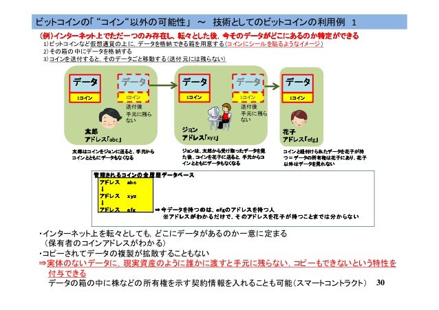 30. 30. 30 ビットコインの「 “コイン“以外の可能性」 ~ 技術としてのビットコインの利用例 1 (例)インターネット上でただ一つのみ存在し,転々とした後,今そのデータがどこにあるのか特定ができる(例)インターネット上でただ一つのみ存在し,転々とした後,今そのデータがどこにあるのか特定ができる(例)インターネット上でただ一つのみ存在し,転々とした後,今そのデータがどこにあるのか特定ができる(例)インターネット上でただ一つのみ存在し,転々とした後,今そのデータがどこにあるのか特定ができる 1)ビットコインなど仮想通貨の上に,データを格納できる箱を用意する(コインにシールを貼るようなイメージ) 2)その箱の中にデータを格納する 3)コインを送付すると,そのデータごと移動する(送付元には残らない) データデータデータデータ 1コインコインコインコイン データデータデータデータ 1コインコインコインコイン データデータデータデータ 1コインコインコインコイン データデータデータデータ 1コインコインコインコイン データデータデータデータ 1コインコインコインコイン 太郎はコインをジョンに送ると,手元から太郎はコインをジョンに送ると,手元から太郎はコインをジョンに送ると,手元から太郎はコインをジョンに送ると,手元から コインとともにデータもなくなるコインとともにデータもなくなるコインとともにデータもなくなるコインとともにデータもなくなる 太郎太郎太郎太郎 アドレス「アドレス「アドレス「アドレス「abc」」」」 ジョンジョンジョンジョン アドレス「アドレス「アドレス「アドレス「xyz」」」」 花子花子花子花子 アドレス「アドレス「アドレス「アドレス「efg」」」」 ジョンは,太郎から受け取ったデータを見ジョンは,太郎から受け取ったデータを見ジョンは,太郎から受け取ったデータを見ジョンは,太郎から受け取ったデータを見 た後,コインを花子に送ると,手元からコた後,コインを花子に送ると,手元からコた後,コインを花子に送ると,手元からコた後,コインを花子に送ると,手元からコ インとともにデータもなくなるインとともにデータもなくなるインとともにデータもなくなるインとともにデータもなくなる コインと紐付けられたデータを花子が持コインと紐付けられたデータを花子が持コインと紐付けられたデータを花子が持コインと紐付けられたデータを花子が持 つ=データの所有権は花子にあり,花子つ=データの所有権は花子にあり,花子つ=データの所有権は花子にあり,花子つ=データの所有権は花子にあり,花子 以外はデータを見れない以外はデータを見れない以外はデータを見れない以外はデータを見れない ・インターネット上を転々としても,どこにデータがあるのか一意に定まる (保有者のコインアドレスがわかる) ・コピーされてデータの複製が拡散することもない ⇒実体のないデータに,現実資産のように誰かに渡すと手元に残らない,コピーもできないという特性を 付与できる データの箱の中に株などの所有権を示す契約情報を入れることも可能(スマートコントラクト) 送付後 手元に残ら ない 送付後 手元に残ら ない 管理されるコインの全履歴データベース管理されるコインの全履歴データベース管理されるコインの全履歴データベース管理されるコインの全履歴データベース アドレスアドレスアドレスアドレス abcabcabcabc ↓↓↓↓ アドレスアドレスアドレスアドレス xyzxyzxyzxyz ↓↓↓↓ アドレスアドレスアドレスアドレス efgefgefgefg ⇒今データを持つのは,efgのアドレスを持つ人⇒今データを持つのは,efgのアドレスを持つ人⇒今データを持つのは,efgのアドレスを持つ人⇒今データを持つのは,efgのアドレスを持つ人   ※アドレスがわかるだけで,そのアドレスを花子が持つことまでは分からない  ※アドレスがわかるだけで,そのアドレスを花子が持つことまでは分からない  ※アドレスがわかるだけで,そのアドレスを花子が持つことまでは分からない  ※アドレスがわかるだけで,そのアドレスを花子が持つことまでは分からない