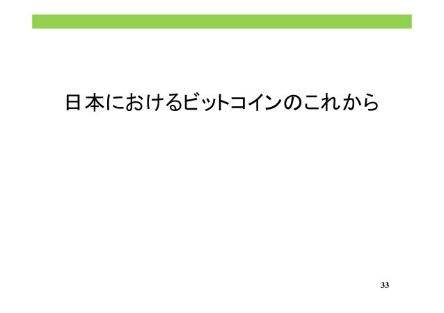 34. 34. ●日本のビットコインのユーザー数は海外に比べ非常に少なく,まだまだ初期段階にある (Mt.Goxの日本人口座数は1,000程度) ●日本では便利な決済手段が既に普及しており,国内でビットコインが大きく発展するかは未知数 ●日本ではお財布ケータイ、suicaなど簡単に決済に使える手段が既に広く普及しており,ビットコイン の「手軽な決済手段」としてのメリットは海外送付やネットでの買い物などに限られている。 ●日本ではコンテンツビジネス,関連するコミュニティが成長していることから,日本でのビットコイン ビジネスとしては,ネット上での投げ銭的使い方や,ページ単位での課金など, ビットコインを用いた10円,100円という今まで手数料対比で現実的ではなかった 少額決済サービスが有望 ●一方,海外では手軽な決済手段は乏しく,実店舗でビットコインを用いて携帯端末で支払いを行う ことが非常に革新的に受け止められている。 またクレジットカードの普及率も低いためビットコインの入り込む余地が大きい。 ●特に銀行口座さえ持っていない途上国の人々には,金融サービスを享受できる非常に有望な インフラになりうる 日本でのビットコインのこれから 1 34
