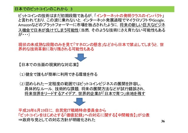 36. 36. 日本でのビットコインのこれから 3 36 ビットコインの技術はまだ初期段階であるが,「インターネットの発明クラスのインパクト」 と言われており,この波に乗れないと,インターネット発展過程でマイクロソフトやGoogle, Amazonなどのプラットフォーマーに市場を独占されたように,将来の新しい巨大なビジネ ス機会で日本が負けてしまう可能性(当然,そのような技術にさえ育たない可能性もある が・・・) 現状の未成熟な段階のみを見て「マネロンの懸念」などから日本で禁止してしまうと,世 界的な技術革新に取り残される可能性もある 【日本での当面の現実的な対応案】 (1)健全で誰もが簡単に利用できる環境を作る (2)認められた一定程度の範囲ではビットコインビジネスの展開を許容し, 具体的なルール,技術的な課題,将来の展開方法などが試行錯誤され, 将来世界をリードするアイデア,世界的企業が「日本で育つ」余地を残す 平成26年6月19日に,自民党IT戦略特命委員会から 「ビットコインをはじめとする「価値記録」への対応に関する【中間報告】」が公表 ⇒政府与党としての対応方針が明確化された