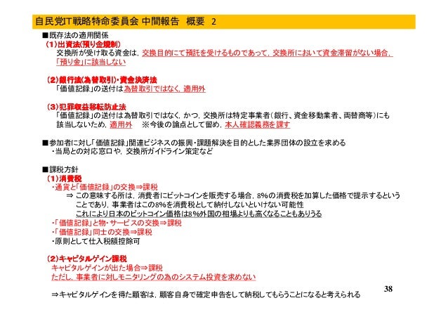 38. 38. 38 ■既存法の適用関係 ((((1)出資法1)出資法1)出資法1)出資法((((預り金規制預り金規制預り金規制預り金規制)))) 交換所が受け取る資金は,交換目的にて預託を受けるものであって,交換所において資金滞留がない場合, 「預り金」に該当しない ((((2)銀行法2)銀行法2)銀行法2)銀行法((((為替取引為替取引為替取引為替取引))))・資金決済法・資金決済法・資金決済法・資金決済法 「価値記録」の送付は為替取引ではなく,適用外 ((((3)犯罪収益移転防止法3)犯罪収益移転防止法3)犯罪収益移転防止法3)犯罪収益移転防止法 「価値記録」の送付は為替取引ではなく,かつ,交換所は特定事業者(銀行、資金移動業者、両替商等)にも 該当しないため,適用外 ※今後の論点として留め,本人確認義務を課す ■参加者に対し「価値記録」関連ビジネスの振興・課題解決を目的とした業界団体の設立を求める ・当局との対応窓口や,交換所ガイドライン策定など ■課税方針 (1)消費税(1)消費税(1)消費税(1)消費税 ・通貨と「価値記録」の交換⇒課税 ⇒ この意味する所は,消費者にビットコインを販売する場合,8%の消費税を加算した価格で提示するという ことであり,事業者はこの8%を消費税として納付しないといけない可能性 これにより日本のビットコイン価格は8%外国の相場よりも高くなることもありうる ・「価値記録」と物・サービスの交換⇒課税 ・「価値記録」同士の交換⇒課税 ・原則として仕入税額控除可 ((((2)キャピタルゲイン課税2)キャピタルゲイン課税2)キャピタルゲイン課税2)キャピタルゲイン課税 キャピタルゲインが出た場合⇒課税 ただし,事業者に対しモニタリングの為のシステム投資を求めない ⇒キャピタルゲインを得た顧客は,顧客自身で確定申告をして納税してもらうことになると考えられる 自民党IT戦略特命委員会 中間報告 概要 2