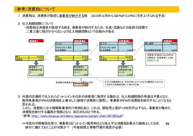 39. 39. (参考)消費税について 39 製造者A製造者A製造者A製造者A 卸売業者B卸売業者B卸売業者B卸売業者B 小売業者C小売業者C小売業者C小売業者C 消費者D消費者D消費者D消費者D 仕入れ 54,000 仕入れ 75,600 購入価格 108,000 うち仕入れに含ま れる消費税 4,000 (1) うち仕入れに含ま れる消費税 5,600 (2) うち消費税負担額 8,000 売上 50,000 売上 70,000 売上 100,000 消費税 4,000 (1) 消費税 5,600 (2) 消費税 8,000 (3) 製造者A 卸売業者B 小売業者C 消費税納付額 消費税納付額 消費税納付額 (1) (2)-(1) (3)-(2) 4,000 1,600 2,400 各段階の事業者が納付した消費税の合計 8,000 消費者Dが負担した8,000円の 消費税は,各事業者により納 付されている ※仕入税額控除とは,自分の売り上げにかかる消費税から仕入れ に含まれる消費税を除いて納付する事 1 消費税は,消費者が負担し事業者が納付する税 (2015年10月からは8%から10%に引き上げられる予定) 2 仕入税額控除について ・消費税は消費者が負担する税を,事業者が納付するため,生産・流通などの各取引段階で 二重三重に税がかからないよう仕入税額控除という仕組みがある 3 外国の交換所で仕入れたビットコインを日本の消費者に販売する場合は,仕入税額控除の考慮は不要となり, 販売事業者が8%の消費税を上乗せした価格で消費者に販売し,事業者が8%の消費税を納付することになると 思われる。 しかし,消費税には小規模事業者向け特例もあり,これは,課税売上高が1,000万円以下なら,事業者が集めた 消費税を納付する義務が免除となり,自己のものとできる。 (参考:http://www.nta.go.jp/shiraberu/ippanjoho/pamph/shohi/201303.pdf) ⇒今回の中間報告を受け,事業者はビットコイン販売時はとりあえずは消費税を乗せた価格としておき, 納付に備えておくことが対策か? (今後税理士等専門家の意見が必要)