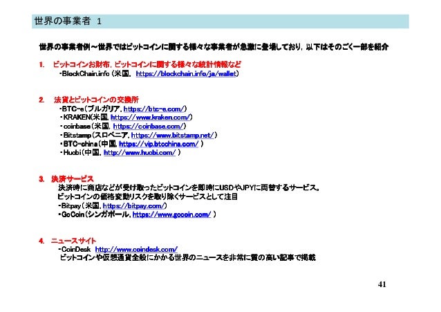 41. 41. 世界の事業者例~世界ではビットコインに関する様々な事業者が急激に登場しており,以下はそのごく一部を紹介世界の事業者例~世界ではビットコインに関する様々な事業者が急激に登場しており,以下はそのごく一部を紹介世界の事業者例~世界ではビットコインに関する様々な事業者が急激に登場しており,以下はそのごく一部を紹介世界の事業者例~世界ではビットコインに関する様々な事業者が急激に登場しており,以下はそのごく一部を紹介 1.1.1.1. ビットコインお財布,ビットコインに関する様々な統計情報などビットコインお財布,ビットコインに関する様々な統計情報などビットコインお財布,ビットコインに関する様々な統計情報などビットコインお財布,ビットコインに関する様々な統計情報など ・・・・BlockChain.info (BlockChain.info (BlockChain.info (BlockChain.info (米国,米国,米国,米国, httpshttpshttpshttps://blockchain.info/ja/wallet://blockchain.info/ja/wallet://blockchain.info/ja/wallet://blockchain.info/ja/wallet)))) 2.2.2.2. 法貨とビットコインの交換所法貨とビットコインの交換所法貨とビットコインの交換所法貨とビットコインの交換所 ・・・・BTCBTCBTCBTC----eeee(ブルガリア(ブルガリア(ブルガリア(ブルガリア,,,, httpshttpshttpshttps://btc://btc://btc://btc----e.com/e.com/e.com/e.com/)))) ・・・・KRAKEN(KRAKEN(KRAKEN(KRAKEN(米国米国米国米国,,,, https://www.kraken.comhttps://www.kraken.comhttps://www.kraken.comhttps://www.kraken.com////)))) ・・・・coinbasecoinbasecoinbasecoinbase(米国,(米国,(米国,(米国,https://coinbase.com/https://coinbase.com/https://coinbase.com/https://coinbase.com/)))) ・・・・BitstampBitstampBitstampBitstamp((((スロベニアスロベニアスロベニアスロベニア,,,, httpshttpshttpshttps://www.bitstamp.net/://www.bitstamp.net/://www.bitstamp.net/://www.bitstamp.net/)))) ・・・・BTCBTCBTCBTC----chinachinachinachina(中国(中国(中国(中国,,,, https://vip.btcchina.comhttps://vip.btcchina.comhttps://vip.btcchina.comhttps://vip.btcchina.com//// )))) ・・・・HuHuHuHuoooobibibibi(中国,(中国,(中国,(中国,http://www.huobi.comhttp://www.huobi.comhttp://www.huobi.comhttp://www.huobi.com//// )))) 3.3.3.3. 決済サービス決済サービス決済サービス決済サービス 決済決済決済決済時に商店などが受け取ったビットコインを即時に時に商店などが受け取ったビットコインを即時に時に商店などが受け取ったビットコインを即時に時に商店などが受け取ったビットコインを即時にUSDUSDUSDUSDややややJPYJPYJPYJPYに両替するサービス。に両替するサービス。に両替するサービス。に両替するサービス。 ビットコインビットコインビットコインビットコインの価格変動リスクを取り除くサービスとして注目の価格変動リスクを取り除くサービスとして注目の価格変動リスクを取り除くサービスとして注目の価格変動リスクを取り除くサービスとして注目 ・・・・BitpayBitpayBitpayBitpay(米国(米国(米国(米国,,,, https://bitpay.comhttps://bitpay.comhttps://bitpay.comhttps://bitpay.com////)))) ・・・・GoCoinGoCoinGoCoinGoCoin(シンガポール(シンガポール(シンガポール(シンガポール,,,, httpshttpshttpshttps://www.gocoin.com://www.gocoin.com://www.gocoin.com://www.gocoin.com//// )))) 4.4.4.4. ニュースサイトニュースサイトニュースサイトニュースサイト ・・・・CoinDeskCoinDeskCoinDeskCoinDesk http://www.coindesk.comhttp://www.coindesk.comhttp://www.coindesk.comhttp://www.coindesk.com//// ビットコインや仮想通貨全般にかかる世界のニュースをビットコインや仮想通貨全般にかかる世界のニュースをビットコインや仮想通貨全般にかかる世界のニュースをビットコインや仮想通貨全般にかかる世界のニュースを非常に質の非常に質の非常に質の非常に質の高い記事で掲載高い記事で掲載高い記事で掲載高い記事で掲載 世界の事業者 1 41
