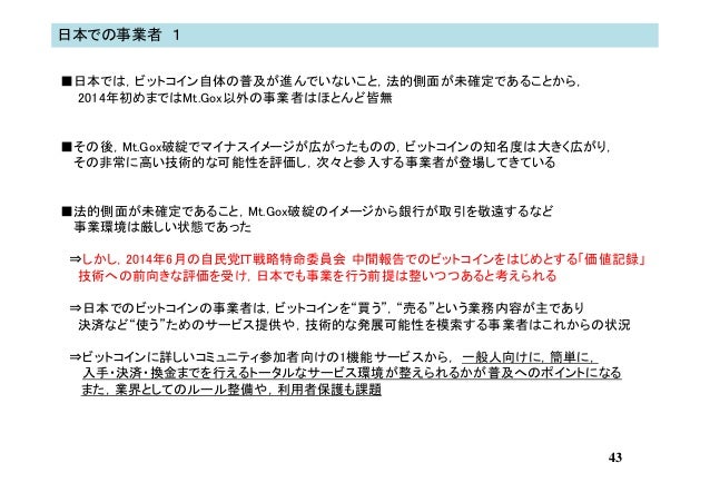 43. 43. 43 日本での事業者 1 ■日本では,ビットコイン自体の普及が進んでいないこと,法的側面が未確定であることから, 2014年初めまではMt.Gox以外の事業者はほとんど皆無 ■その後,Mt.Gox破綻でマイナスイメージが広がったものの,ビットコインの知名度は大きく広がり, その非常に高い技術的な可能性を評価し,次々と参入する事業者が登場してきている ■法的側面が未確定であること,Mt.Gox破綻のイメージから銀行が取引を敬遠するなど 事業環境は厳しい状態であった ⇒しかし,2014年6月の自民党IT戦略特命委員会 中間報告でのビットコインをはじめとする「価値記録」 技術への前向きな評価を受け,日本でも事業を行う前提は整いつつあると考えられる ⇒日本でのビットコインの事業者は,ビットコインを“買う”,“売る”という業務内容が主であり 決済など“使う”ためのサービス提供や,技術的な発展可能性を模索する事業者はこれからの状況 ⇒ビットコインに詳しいコミュニティ参加者向けの1機能サービスから, 一般人向けに,簡単に, 入手・決済・換金までを行えるトータルなサービス環境が整えられるかが普及へのポイントになる また,業界としてのルール整備や,利用者保護も課題
