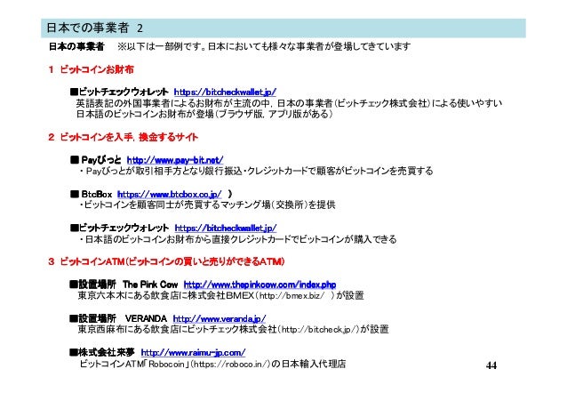 44. 44. 44 日本での事業者 2 日本の事業者日本の事業者日本の事業者日本の事業者 ※以下は一部例です。日本においても様々な事業者が登場してきています 1111 ビットコインお財布ビットコインお財布ビットコインお財布ビットコインお財布 ■ビットチェックウォレット■ビットチェックウォレット■ビットチェックウォレット■ビットチェックウォレット https://bitcheckwallet.jp/https://bitcheckwallet.jp/https://bitcheckwallet.jp/https://bitcheckwallet.jp/ 英語表記の外国事業者によるお財布が主流の中,日本の事業者(ビットチェック株式会社)による使いやすい 日本語のビットコインお財布が登場(ブラウザ版,アプリ版がある) 2222 ビットコインを入手,換金するサイトビットコインを入手,換金するサイトビットコインを入手,換金するサイトビットコインを入手,換金するサイト ■■■■ PayPayPayPayびっとびっとびっとびっと http://www.payhttp://www.payhttp://www.payhttp://www.pay----bit.net/bit.net/bit.net/bit.net/ ・ Payびっとが取引相手方となり銀行振込・クレジットカードで顧客がビットコインを売買する ■■■■ BtcBoxBtcBoxBtcBoxBtcBox httpshttpshttpshttps://www.btcbox.co.jp://www.btcbox.co.jp://www.btcbox.co.jp://www.btcbox.co.jp//// )))) ・ビットコインを顧客同士が売買するマッチング場(交換所)を提供 ■■■■ビットチェックウォレットビットチェックウォレットビットチェックウォレットビットチェックウォレット httpshttpshttpshttps://bitcheckwallet.jp://bitcheckwallet.jp://bitcheckwallet.jp://bitcheckwallet.jp//// ・日本語のビットコインお財布から直接クレジットカードでビットコインが購入できる 3333 ビットコインビットコインビットコインビットコインATMATMATMATM(ビットコインの買いと売りができるATM)(ビットコインの買いと売りができるATM)(ビットコインの買いと売りができるATM)(ビットコインの買いと売りができるATM) ■設置場所■設置場所■設置場所■設置場所 TheTheTheThe Pink CowPink CowPink CowPink Cow http://http://http://http://www.thepinkcow.com/index.phpwww.thepinkcow.com/index.phpwww.thepinkcow.com/index.phpwww.thepinkcow.com/index.php 東京六本木にある飲食店に株式会社BMEX(http://bmex.biz/ )が設置 ■設置場所■設置場所■設置場所■設置場所 VERANDAVERANDAVERANDAVERANDA http://www.veranda.jphttp://www.veranda.jphttp://www.veranda.jphttp://www.veranda.jp//// 東京西麻布にある飲食店にビットチェック株式会社(http://bitcheck.jp/)が設置 ■株式会社来夢■株式会社来夢■株式会社来夢■株式会社来夢 http://www.raimuhttp://www.raimuhttp://www.raimuhttp://www.raimu----jp.comjp.comjp.comjp.com//// ビットコインATM「Robocoin」(https://roboco.in/)の日本輸入代理店