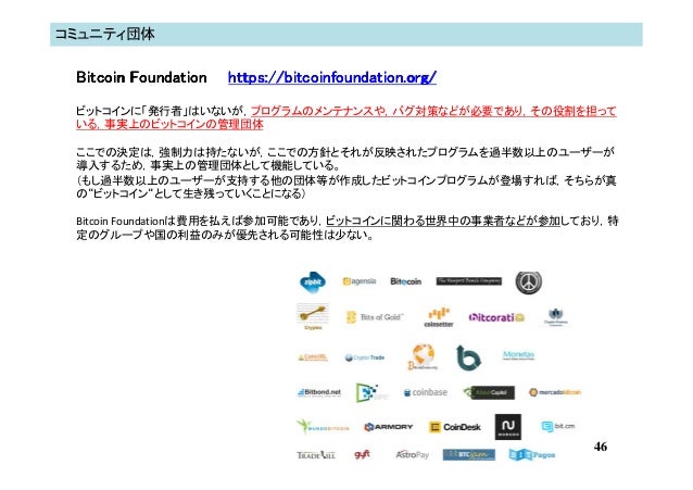 46. 46. 46 コミュニティ団体 Bitcoin FoundationBitcoin FoundationBitcoin FoundationBitcoin Foundation httpshttpshttpshttps://bitcoinfoundation.org://bitcoinfoundation.org://bitcoinfoundation.org://bitcoinfoundation.org//// ビットコインに「発行者」はいないが,プログラムのメンテナンスや,バグ対策などが必要であり,その役割を担って いる,事実上のビットコインの管理団体 ここでの決定は,強制力は持たないが,ここでの方針とそれが反映されたプログラムを過半数以上のユーザーが 導入するため,事実上の管理団体として機能している。 (もし過半数以上のユーザーが支持する他の団体等が作成したビットコインプログラムが登場すれば,そちらが真 の“ビットコイン“として生き残っていくことになる) Bitcoin Foundationは費用を払えば参加可能であり,ビットコインに関わる世界中の事業者などが参加しており,特 定のグループや国の利益のみが優先される可能性は少ない。