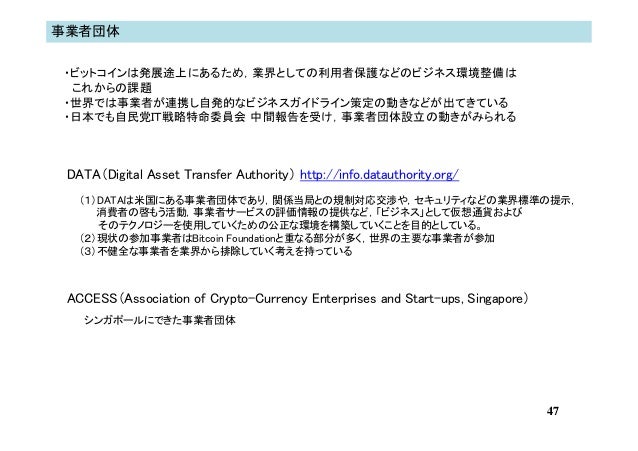 47. 47. 47 事業者団体 DATA(Digital Asset Transfer Authority) http://info.datauthority.org/ (1)DATAは米国にある事業者団体であり,関係当局との規制対応交渉や,セキュリティなどの業界標準の提示, 消費者の啓もう活動,事業者サービスの評価情報の提供など,「ビジネス」として仮想通貨および そのテクノロジーを使用していくための公正な環境を構築していくことを目的としている。 (2)現状の参加事業者はBitcoin Foundationと重なる部分が多く,世界の主要な事業者が参加 (3)不健全な事業者を業界から排除していく考えを持っている ACCESS(Association of Crypto-Currency Enterprises and Start-ups, Singapore) シンガポールにできた事業者団体 ・ビットコインは発展途上にあるため,業界としての利用者保護などのビジネス環境整備は これからの課題 ・世界では事業者が連携し自発的なビジネスガイドライン策定の動きなどが出てきている ・日本でも自民党IT戦略特命委員会 中間報告を受け,事業者団体設立の動きがみられる