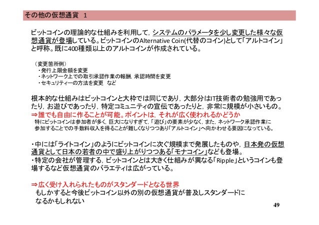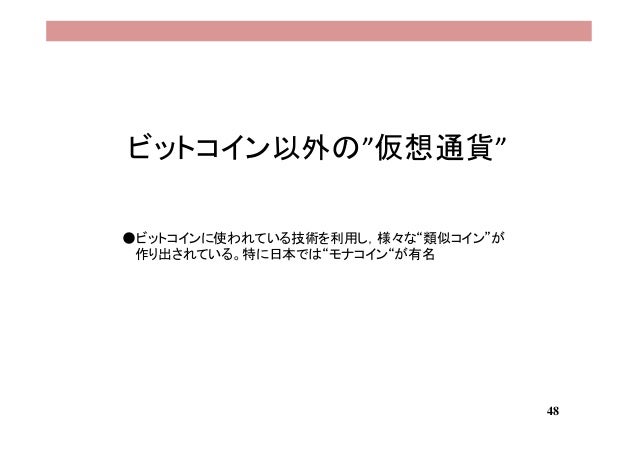 48. 48. 48 ビットコイン以外の”仮想通貨” ●ビットコインに使われている技術を利用し,様々な“類似コイン”が 作り出されている。特に日本では“モナコイン“が有名