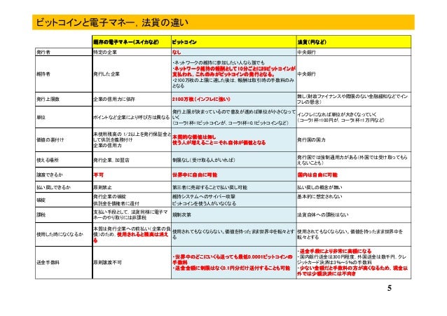 5. 5. ビットコインと電子マネー,法貨の違い 5 既存の電子マネー(スイカなど)既存の電子マネー(スイカなど)既存の電子マネー(スイカなど)既存の電子マネー(スイカなど) ビットコインビットコインビットコインビットコイン 法貨(円など)法貨(円など)法貨(円など)法貨(円など) 発行者 特定の企業 なしなしなしなし 中央銀行 維持者 発行した企業 ・ネットワークの維持に参加したい人なら誰でも ・ネットワーク維持の報酬として10分ごとに25ビットコインがネットワーク維持の報酬として10分ごとに25ビットコインがネットワーク維持の報酬として10分ごとに25ビットコインがネットワーク維持の報酬として10分ごとに25ビットコインが 支払われ,これのみがビットコインの発行となる。支払われ,これのみがビットコインの発行となる。支払われ,これのみがビットコインの発行となる。支払われ,これのみがビットコインの発行となる。 ・2100万枚の上限に達した後は,報酬は取引時の手数料のみ となる 中央銀行 発行上限数 企業の信用力に依存 2100万枚(インフレに強い)2100万枚(インフレに強い)2100万枚(インフレに強い)2100万枚(インフレに強い) 無し(財政ファイナンスや際限のない金融緩和などでイン フレの懸念) 使える場所 発行企業,加盟店 制限なし(受け取る人がいれば) 発行国では強制通用力がある(外国では受け取ってもら えないことも) 譲渡できるか 不可不可不可不可 世界中に自由に可能世界中に自由に可能世界中に自由に可能世界中に自由に可能 国内は自由に可能国内は自由に可能国内は自由に可能国内は自由に可能 払い戻しできるか 原則禁止 第三者に売却することで払い戻し可能 払い戻しの概念が無い 発行企業の破綻 維持システムへのサイバー攻撃 基本的に想定されない 供託金を債権者に還付 ビットコインを使う人がいなくなる 使用した時になくなるか 本質は発行企業への前払い(企業の負 債)のため,使用されると残高は消え使用されると残高は消え使用されると残高は消え使用されると残高は消え るるるる 使用されてもなくならない。価値を持ったまま世界中を転々とす る 使用されてもなくならない。価値を持ったまま世界中を 転々とする 送金手数料 原則譲渡不可 破綻 課税 規制次第 法貨自体への課税はない 単位 発行上限が決まっているので普及が進めば単位が小さくなって いく (コーラ1杯=1ビットコインが,コーラ1杯=0.1ビットコインなど) インフレになれば単位が大きくなっていく (コーラ1杯=100円が,コーラ1杯=1万円など) 価値の裏付け 本質的な価値は無し本質的な価値は無し本質的な価値は無し本質的な価値は無し 使う人が増えること=それ自体が価値となる使う人が増えること=それ自体が価値となる使う人が増えること=それ自体が価値となる使う人が増えること=それ自体が価値となる 発行国の国力 ポイントなど企業により呼び方は異なる 支払い手段として,法貨同様に電子マ ネーのやり取りには非課税 ・送金手段により非常に高額になる送金手段により非常に高額になる送金手段により非常に高額になる送金手段により非常に高額になる ・国内銀行送金は300円程度,外国送金は数千円,クレ ジットカード決済は3%~5%の手数料 ・少ない金額だと手数料の方が高くなるため,現金以少ない金額だと手数料の方が高くなるため,現金以少ない金額だと手数料の方が高くなるため,現金以少ない金額だと手数料の方が高くなるため,現金以 外では少額決済には不向き外では少額決済には不向き外では少額決済には不向き外では少額決済には不向き 未使用残高の 1/2以上を発行保証金と して供託を義務付け 企業の信用力 ・世界中のどこにいくら送っても最低0.0001ビットコインの・世界中のどこにいくら送っても最低0.0001ビットコインの・世界中のどこにいくら送っても最低0.0001ビットコインの・世界中のどこにいくら送っても最低0.0001ビットコインの 手数料手数料手数料手数料 ・送金金額に制限はなく0.1円分だけ送付することも可能・送金金額に制限はなく0.1円分だけ送付することも可能・送金金額に制限はなく0.1円分だけ送付することも可能・送金金額に制限はなく0.1円分だけ送付することも可能