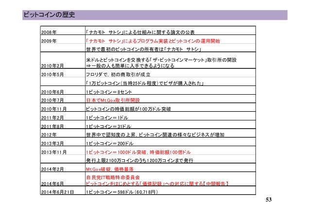 53. 53. ビットコインの歴史 53 2008年 「ナカモト サトシ」による仕組みに関する論文の公表 2009年 「ナカモト サトシ」によるプログラム実装とビットコインの運用開始 世界で最初のビットコインの所有者は「ナカモト サトシ」 2010年2月 米ドルとビットコインを交換する「ザ・ビットコインマーケット」取引所の開設 ⇒一般の人も簡単に入手できるようになる 2010年5月 フロリダで,初の商取引が成立 「1万ビットコイン(当時25ドル程度)でピザが購入された」 2010年6月 1ビットコイン=8セント 2010年7月 日本でMt.Gox取引所開設 2010年11月 ビットコインの時価総額が100万ドル突破 2011年2月 1ビットコイン=1ドル 2011年8月 1ビットコイン=31ドル 2012年 世界中で認知度の上昇,ビットコイン関連の様々なビジネスが増加 2013年3月 1ビットコイン=200ドル 2013年11月 1ビットコイン=1000ドル突破,時価総額100億ドル 発行上限2100万コインのうち1200万コインまで発行 2014年2月 Mt.Gox破綻,価格暴落 2014年6月 自民党IT戦略特命委員会 ビットコインをはじめとする「価値記録」への対応に関する【中間報告】 2014年6月21日 1ビットコイン=598ドル(60,718円)