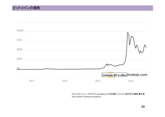 54. 54. ビットコインニュースサイト「coindesk」による各国ビットコイン取引所の価格集計値 http://www.coindesk.com/price/ ビットコインの価格 54