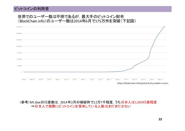 55. 55. (参考)Mt.Goxの口座数は,2014年2月の破綻時で12万7千程度,うち日本人は1,000口座程度 ⇒日本人で実際にビットコインを保有している人数はまだまだ少ない 世界でのユーザー数は不明であるが,最大手のビットコイン財布 (BlockChain.info)のユーザー数は2014年6月で175万件を突破(下記図) https://blockchain.info/ja/charts/my-wallet-n-users ビットコインの利用者 55