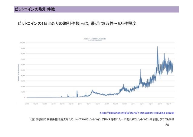 56. 56. ビットコインの1日当たりの取引件数(注)は,最近は5万件~6万件程度 ビットコインの取引件数 56 https://blockchain.info/ja/charts/n-transactions-excluding-popular (注)交換所の取引件数は膨大なため,トップ100のビットコインアドレスを省いた一日あたりのビットコイン取引数。グラフも同様