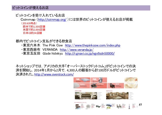 57. 57. ビットコインを受け入れているお店 Coinmap (http://coinmap.org/ )には世界のビットコインが使えるお店が掲載 (2014/6時点) 欧州で約1,500店舗 米国で約2,000店舗 日本は約34店舗 都内でビットコイン支払ができる飲食店 ・東京六本木 The Pink Cow http://www.thepinkcow.com/index.php ・東京西麻布 VERANDA http://www.veranda.jp/ ・東京五反田 Glade hidekyu http://r.gnavi.co.jp/ngv9zdn50000/ ネットショップでは,アメリカの大手「オーバーストックドットコム」がビットコインでの決 済を開始し,2014年1月から2月で,4,300人の顧客から計100万ドルがビットコインで 決済された。http://www.overstock.com/ ビットコインが使えるお店 57