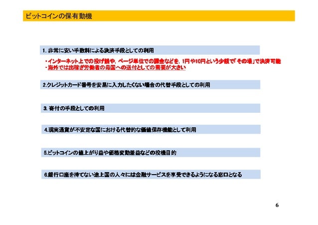 6. 6. 2.2.2.2.クレジットカードクレジットカードクレジットカードクレジットカード番号を安易に入力したくない場合の代替手段としての利用番号を安易に入力したくない場合の代替手段としての利用番号を安易に入力したくない場合の代替手段としての利用番号を安易に入力したくない場合の代替手段としての利用 3.3.3.3. 寄付寄付寄付寄付の手段としての利用の手段としての利用の手段としての利用の手段としての利用 ビットコインの保有動機 4.4.4.4.現実現実現実現実通貨が不安定な国における代替的な価値保存機能として通貨が不安定な国における代替的な価値保存機能として通貨が不安定な国における代替的な価値保存機能として通貨が不安定な国における代替的な価値保存機能として利用利用利用利用 5.5.5.5.ビットコインの値上がり益や価格変動差益などの投機目的ビットコインの値上がり益や価格変動差益などの投機目的ビットコインの値上がり益や価格変動差益などの投機目的ビットコインの値上がり益や価格変動差益などの投機目的 6 1.1.1.1. 非常に安い手数料による決済手段としての利用非常に安い手数料による決済手段としての利用非常に安い手数料による決済手段としての利用非常に安い手数料による決済手段としての利用 ・・・・インターネット上での投げ銭や,ページ単位での課金などを,インターネット上での投げ銭や,ページ単位での課金などを,インターネット上での投げ銭や,ページ単位での課金などを,インターネット上での投げ銭や,ページ単位での課金などを,1111円や円や円や円や10101010円という少額で「その場」で決済可能円という少額で「その場」で決済可能円という少額で「その場」で決済可能円という少額で「その場」で決済可能 ・・・・海外では出稼ぎ労働者の母国へ海外では出稼ぎ労働者の母国へ海外では出稼ぎ労働者の母国へ海外では出稼ぎ労働者の母国への送付との送付との送付との送付としての需要が大きいしての需要が大きいしての需要が大きいしての需要が大きい 6666....銀行口座を持てない途上国銀行口座を持てない途上国銀行口座を持てない途上国銀行口座を持てない途上国の人々には金融サービスを享受できるようになる窓口との人々には金融サービスを享受できるようになる窓口との人々には金融サービスを享受できるようになる窓口との人々には金融サービスを享受できるようになる窓口となるなるなるなる