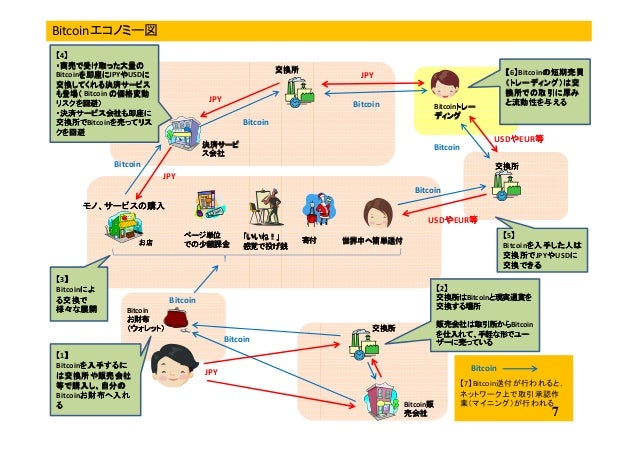 7. 7. 【7】Bitcoin送付が行われると, ネットワーク上で取引承認作 業(マイニング)が行われる Bitcoin JPY 交換所交換所交換所交換所 交換所交換所交換所交換所 交換所交換所交換所交換所 Bitcoin販販販販 売会社売会社売会社売会社 Bitcoin お財布お財布お財布お財布 (ウォレット)(ウォレット)(ウォレット)(ウォレット) お店お店お店お店 モノ、サービスの購入モノ、サービスの購入モノ、サービスの購入モノ、サービスの購入 「いいね!」「いいね!」「いいね!」「いいね!」 感覚で投げ銭感覚で投げ銭感覚で投げ銭感覚で投げ銭 ページ単位ページ単位ページ単位ページ単位 でのでのでのでの少額課金少額課金少額課金少額課金 世界中へ簡単送付世界中へ簡単送付世界中へ簡単送付世界中へ簡単送付 決済サービ決済サービ決済サービ決済サービ ス会社ス会社ス会社ス会社 JPY USDややややEUR等等等等 Bitcoin Bitcoinトレートレートレートレー ディングディングディングディング 寄付寄付寄付寄付 Bitcoin Bitcoin Bitcoinエコノミー図 【【【【1】】】】 Bitcoinを入手するにを入手するにを入手するにを入手するに は交換所や販売は交換所や販売は交換所や販売は交換所や販売会社会社会社会社 等で購入し、自分の等で購入し、自分の等で購入し、自分の等で購入し、自分の Bitcoinお財布へお財布へお財布へお財布へ入れ入れ入れ入れ るるるる Bitcoin 【【【【2】】】】 交換所は交換所は交換所は交換所はBitcoinと現実通貨をと現実通貨をと現実通貨をと現実通貨を 交換する場所交換する場所交換する場所交換する場所 販売会社は取引所から販売会社は取引所から販売会社は取引所から販売会社は取引所からBitcoin を仕入れて、手軽な形でユーを仕入れて、手軽な形でユーを仕入れて、手軽な形でユーを仕入れて、手軽な形でユー ザーに売っているザーに売っているザーに売っているザーに売っている 【【【【5】】】】 Bitcoinをををを入手した入手した入手した入手した人人人人はははは 交換所で交換所で交換所で交換所でJPYややややUSDにににに 交換できる交換できる交換できる交換できる 【【【【3】】】】 Bitcoinにににによよよよ る交換でる交換でる交換でる交換で 様々な展開様々な展開様々な展開様々な展開 【【【【4】】】】 ・商売で受け取った大量の・商売で受け取った大量の・商売で受け取った大量の・商売で受け取った大量の Bitcoinを即座にを即座にを即座にを即座にJPYややややUSDにににに 交換してくれる決済サービス交換してくれる決済サービス交換してくれる決済サービス交換してくれる決済サービス も登場(も登場(も登場(も登場( Bitcoin の価格変動の価格変動の価格変動の価格変動 リスクを回避)リスクを回避)リスクを回避)リスクを回避) ・決済サービス会社も即座に・決済サービス会社も即座に・決済サービス会社も即座に・決済サービス会社も即座に 交換所で交換所で交換所で交換所でBitcoinを売ってリスを売ってリスを売ってリスを売ってリス クを回避クを回避クを回避クを回避 JPY Bitcoin 【【【【6】】】】Bitcoinの短期売買の短期売買の短期売買の短期売買 (トレーディング)(トレーディング)(トレーディング)(トレーディング)は交は交は交は交 換所での取引に換所での取引に換所での取引に換所での取引に厚み厚み厚み厚み と流動性を与えると流動性を与えると流動性を与えると流動性を与えるBitcoin JPY Bitcoin USDややややEUR等等等等 7