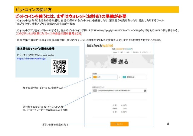 8. 8. 日本語のビットコイン財布も登場日本語のビットコイン財布も登場日本語のビットコイン財布も登場日本語のビットコイン財布も登場 ビットチェック社のbitcheck wallet https://bitcheckwallet.jp/ 8 ビットコインの使い方 ビットコインを使うには、まずはウォレット(お財布)の準備が必要ビットコインを使うには、まずはウォレット(お財布)の準備が必要ビットコインを使うには、まずはウォレット(お財布)の準備が必要ビットコインを使うには、まずはウォレット(お財布)の準備が必要 ・ウォレット(お財布)とはその名の通り、自分の保有するビットコインを保存したり、第三者から受け取ったり、送付したりするツール ・PCブラウザ、携帯アプリで提供されるものが一般的 ・ウォレットアプリをインストールすると、自分のビットコインアドレス(「1PVAYotpZqAgTyShkLSS7KTwYTtLNCV5is」のようなもの)が1つ割り振られる。 (このアドレスが世界にただ一つの自分の固有番号となる) ・自分が第三者にビットコインを送る場合は、自分のウォレットに相手のアドレスと金額を入力してボタンを押すだけという手軽さ。 送付相手のビットコインアドレスを入力 ※バーコードリーダーでの読み込みも可能 相手に送りたいビットコイン金額を入力 ボタンを押せば送付完了