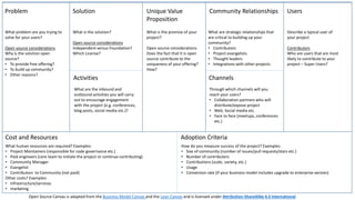 Open Source Canvas is adapted from the Business Model Canvas and the Lean Canvas and is licensed under Attribution-ShareAlike 4.0 International