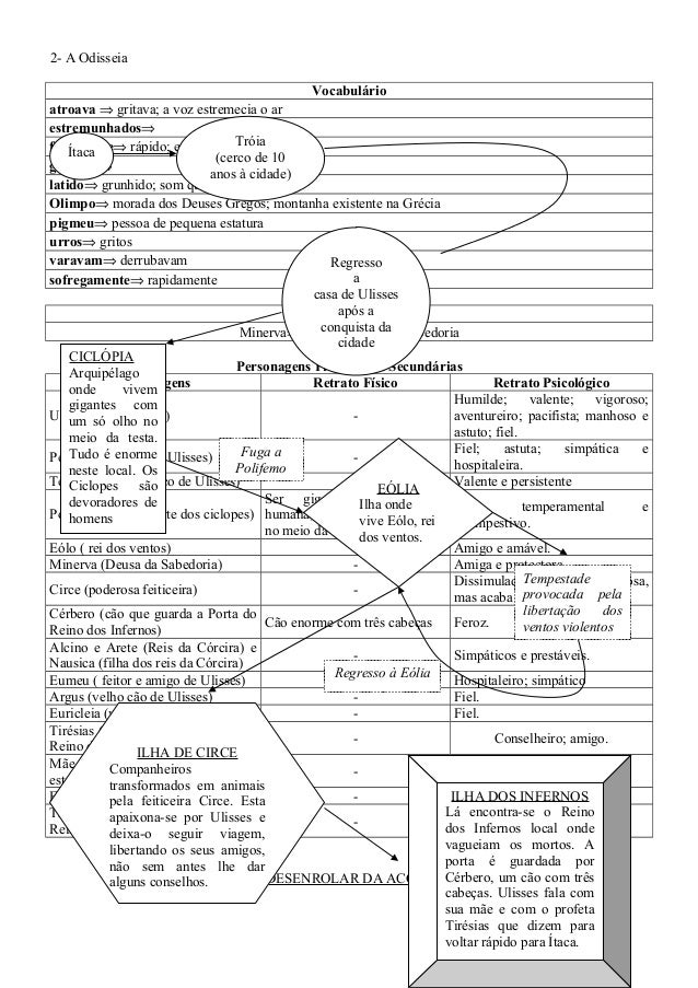 2. 2. 2- A Odisseia Vocabulário atroava ⇒ gritava; a voz estremecia o ar estremunhados⇒ fulgurante⇒ rápido; estonteante gamelas⇒ latido⇒ grunhido; som que os cães emitem Olimpo⇒ morada dos Deuses Gregos; montanha existente na Grécia pigmeu⇒ pessoa de pequena estatura urros⇒ gritos varavam⇒ derrubavam sofregamente⇒ rapidamente Deuses Minerva⇒ Deusa romana da sabedoria Personagens Principais e Secundárias Personagens Retrato Físico Retrato Psicológico Ulisses (Rei de Ítaca) - Humilde; valente; vigoroso; aventureiro; pacifista; manhoso e astuto; fiel. Penélope (esposa de Ulisses) - Fiel; astuta; simpática e hospitaleira. Telémaco (filho único de Ulisses) - Valente e persistente Polifemo (o mais forte dos ciclopes) Ser gigante, com forma humana, mas com um só olho no meio da testa. Mau; temperamental e intempestivo. Eólo ( rei dos ventos) - Amigo e amável. Minerva (Deusa da Sabedoria) - Amiga e protectora. Circe (poderosa feiticeira) - Dissimulada e falsa; mentirosa, mas acaba por arrepender-se. Cérbero (cão que guarda a Porta do Reino dos Infernos) Cão enorme com três cabeças Feroz. Alcino e Arete (Reis da Córcira) e Nausica (filha dos reis da Córcira) - Simpáticos e prestáveis. Eumeu ( feitor e amigo de Ulisses) - Hospitaleiro; simpático Argus (velho cão de Ulisses) - Fiel. Euricleia (velha ama) - Fiel. Tirésias (profeta que se encontra no Reino dos Infernos) - Conselheiro; amigo. Mãe de Ulisses (tinha morrido e estava no Reino dos Infernos) - Amiga; conselheira. Euríloco (marinheiro) - Prudente. Tântalo e Sísifo (almas existentes no Reino dos Infernos) - Cruéis e desumanos. O DESENROLAR DA ACÇÃO... Ítaca Tróia (cerco de 10 anos à cidade) Regresso a casa de Ulisses após a conquista da cidade CICLÓPIA Arquipélago onde vivem gigantes com um só olho no meio da testa. Tudo é enorme neste local. Os Ciclopes são devoradores de homens EÓLIA Ilha onde vive Eólo, rei dos ventos. Fuga a Polifemo Tempestade provocada pela libertação dos ventos violentos Regresso à Eólia ILHA DE CIRCE Companheiros transformados em animais pela feiticeira Circe. Esta apaixona-se por Ulisses e deixa-o seguir viagem, libertando os seus amigos, não sem antes lhe dar alguns conselhos. ILHA DOS INFERNOS Lá encontra-se o Reino dos Infernos local onde vagueiam os mortos. A porta é guardada por Cérbero, um cão com três cabeças. Ulisses fala com sua mãe e com o profeta Tirésias que dizem para voltar rápido para Ítaca.
