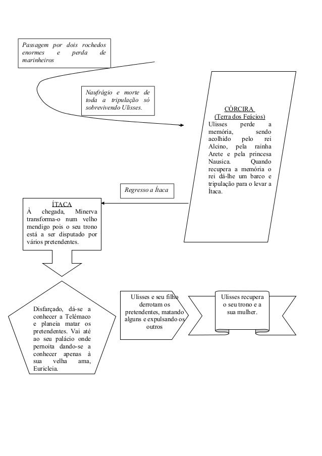 4. 4. Passagem por dois rochedos enormes e perda de marinheiros Naufrágio e morte de toda a tripulação só sobrevivendo Ulisses. CÓRCIRA (Terra dos Feácios) Ulisses perde a memória, sendo acolhido pelo rei Alcino, pela rainha Arete e pela princesa Nausica. Quando recupera a memória o rei dá-lhe um barco e tripulação para o levar a Ítaca.Regresso a Ítaca ÍTACA À chegada, Minerva transforma-o num velho mendigo pois o seu trono está a ser disputado por vários pretendentes. Disfarçado, dá-se a conhecer a Telémaco e planeia matar os pretendentes. Vai até ao seu palácio onde pernoita dando-se a conhecer apenas à sua velha ama, Euricleia. Ulisses e seu filho derrotam os pretendentes, matando alguns e expulsando os outros Ulisses recupera o seu trono e a sua mulher.