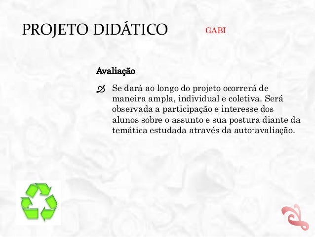 10. 10. PROJETO DIDÁTICO GABI Avaliação  Se dará ao longo do projeto ocorrerá de maneira ampla, individual e coletiva. Será observada a participação e interesse dos alunos sobre o assunto e sua postura diante da temática estudada através da auto-avaliação.