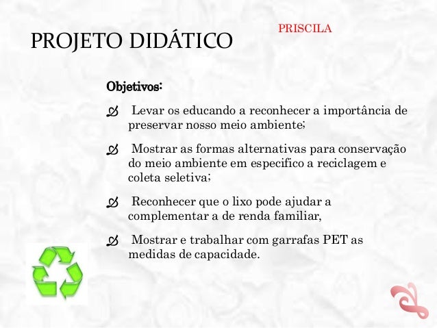 3. 3. PRISCILAPROJETO DIDÁTICO Objetivos:  Levar os educando a reconhecer a importância de preservar nosso meio ambiente;  Mostrar as formas alternativas para conservação do meio ambiente em especifico a reciclagem e coleta seletiva;  Reconhecer que o lixo pode ajudar a complementar a de renda familiar,  Mostrar e trabalhar com garrafas PET as medidas de capacidade.